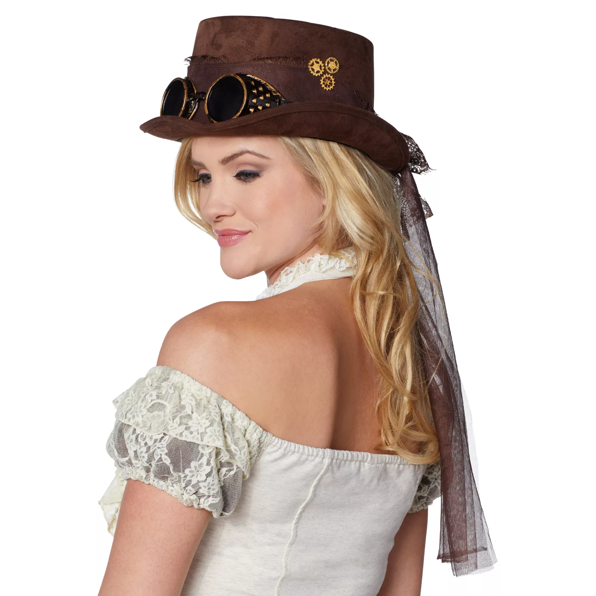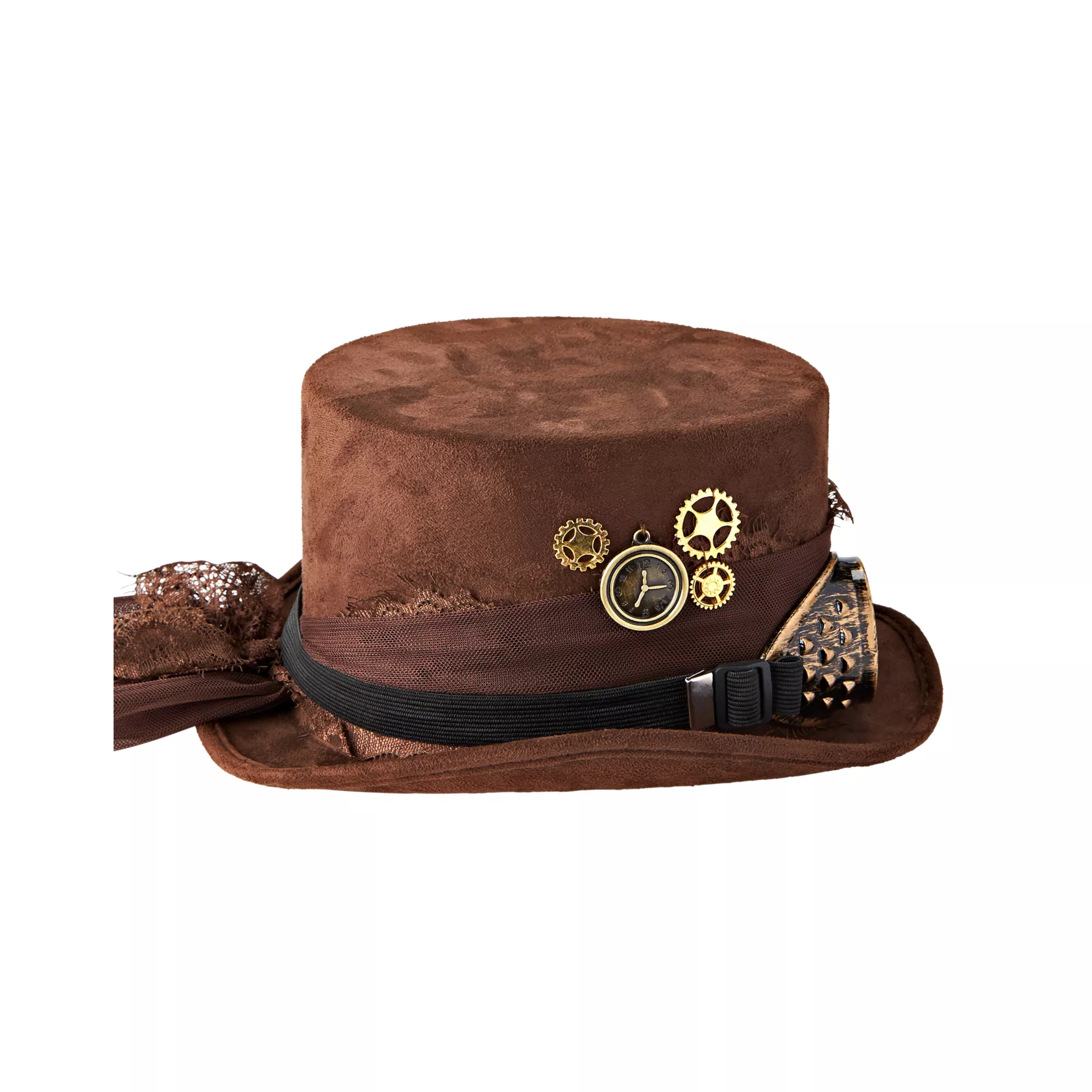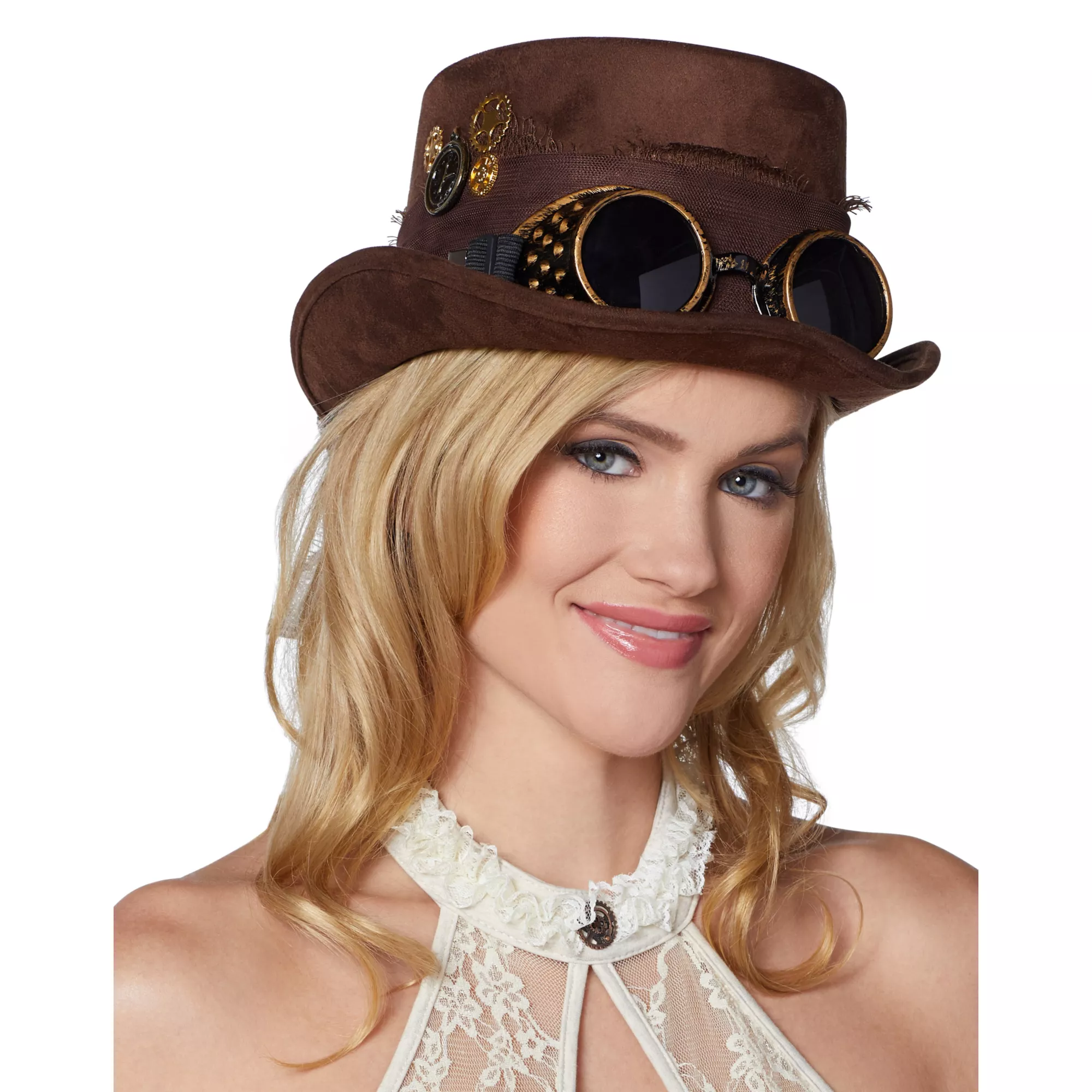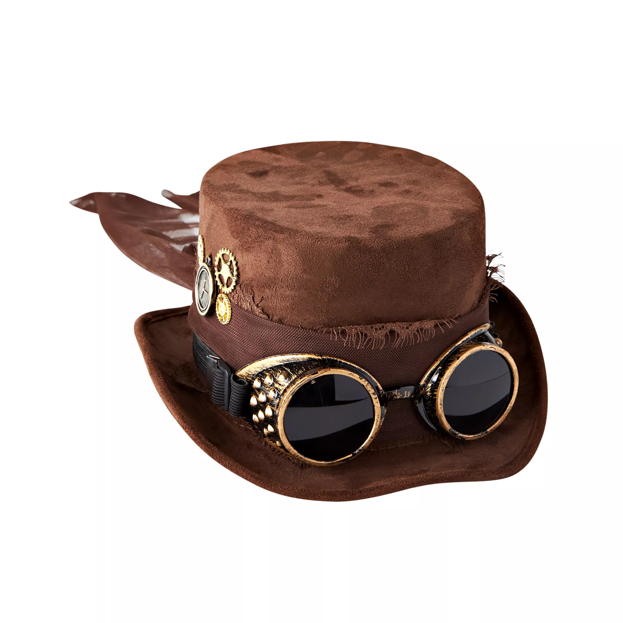 Accent any retrofuturistic style with this steampunk top hat! The included goggles add another layer of vintage fun to this classy geared top hat.