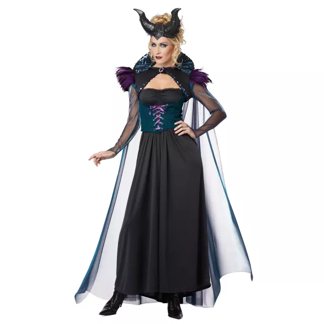 Cast spells on all who threaten your power in this Storybook Sorceress Adult Womens Costume. Perhaps you'll turn a handsome prince over to the dark side in this black gown with teal lace up corset, sheer blue arms, matching cape, purple feathery shoulder pads, shiny collar and evil horns. Good girls are overrated.
