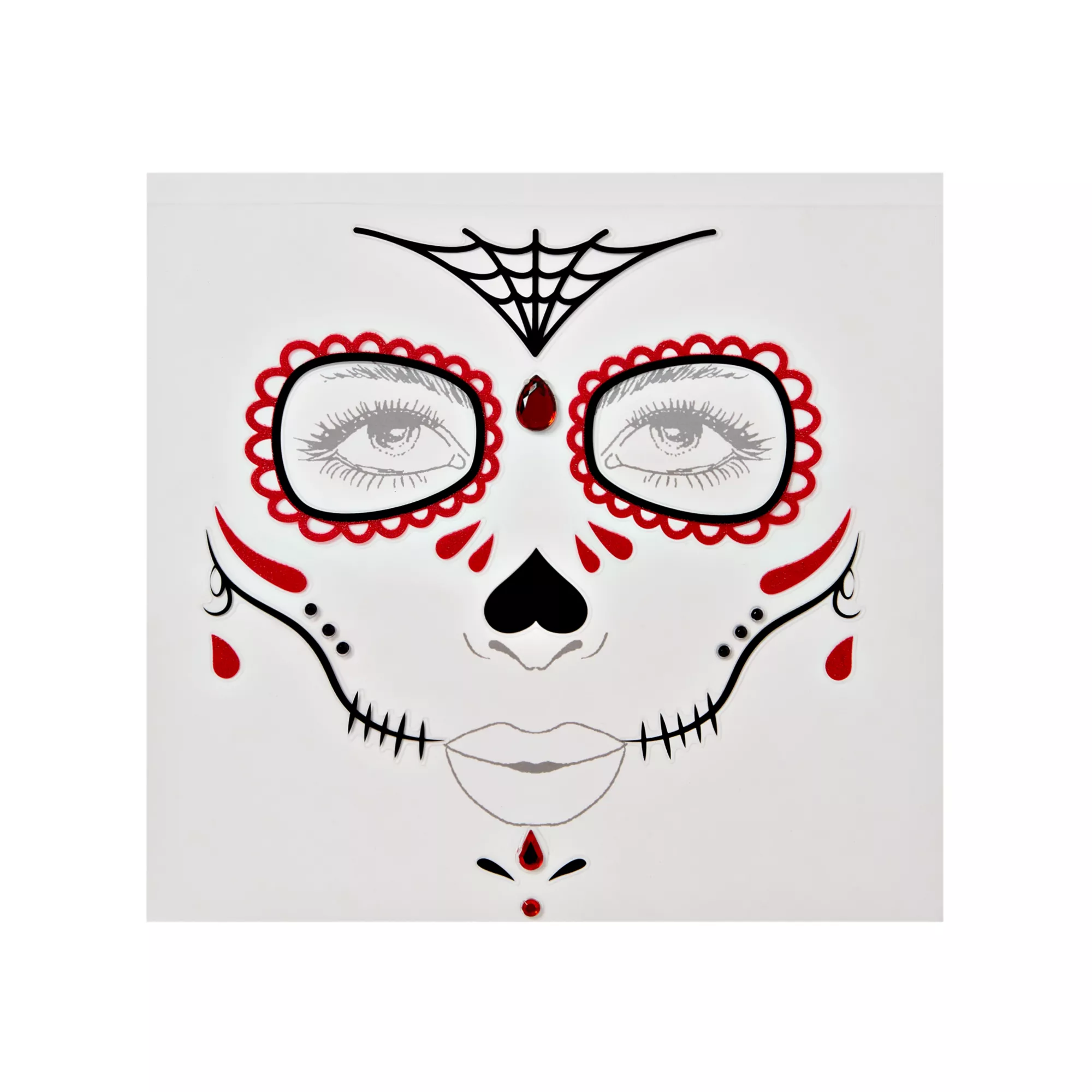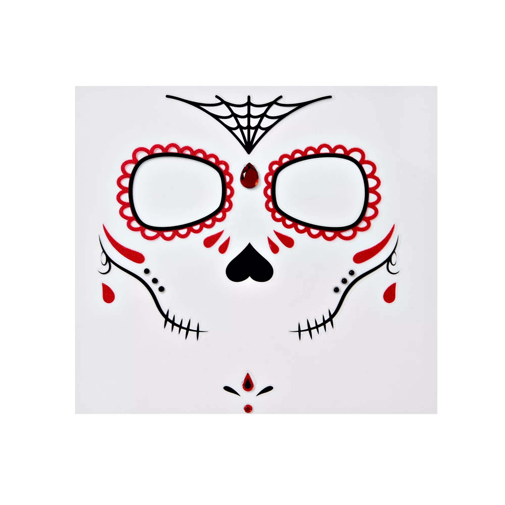 Complete your Day of the Dead costume with the Officially Licensed Sugar Skull Face Decal. Features red and black decals that form the face of a traditional sugar skull.
