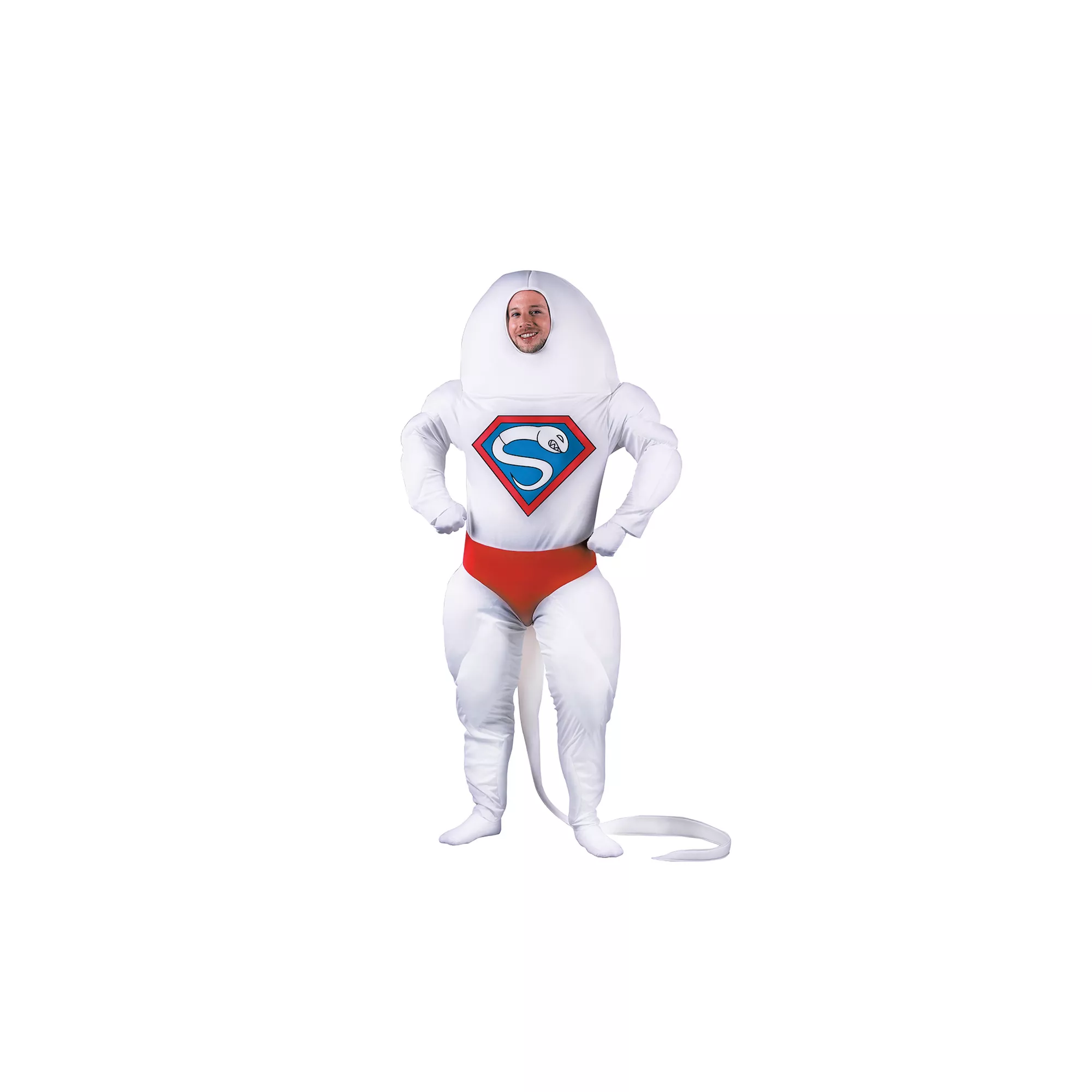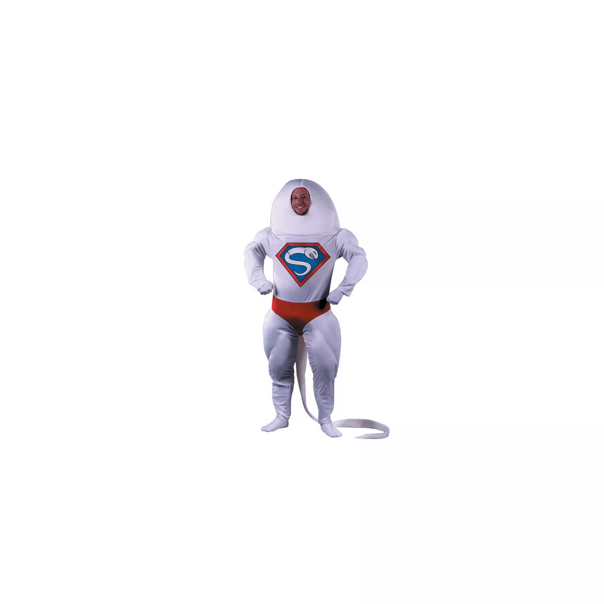 It shall not be said that you ever shoot blanks! Stand erect at all times and at the ready to help out whenever and wherever some extra potent stuff is needed in this Super Sperm adult mens costume. You never know when superhuman efforts may be required, but you can offer to help ladies in need at any time just to keep your skills honed. Bone up in this funny costume - go forth and multiply.