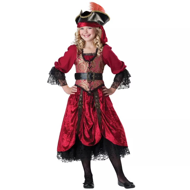 Take the treasure before the pirates do in this Swashbucklin Scarlet Child Costume! Wearing this ruby red dress with golden lace up brocade vest, tulle and lace petticoat, belt and hat with bandana and feather, you'll blow those other swashbucklers out of the water.