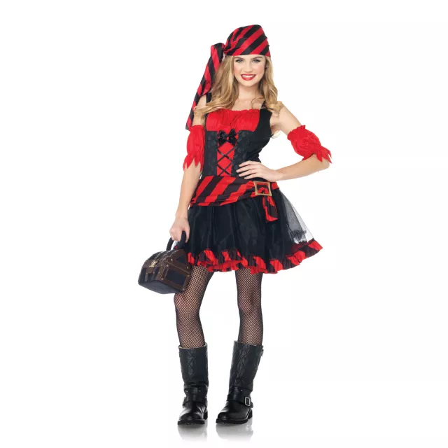 Set sail for a Halloween adventure when you don this delightful red and black Swashbuckling Sweetie tween costume. This elegant costume includes a head scarf and arm puffs with a long faux lace-up bodice wench dress.