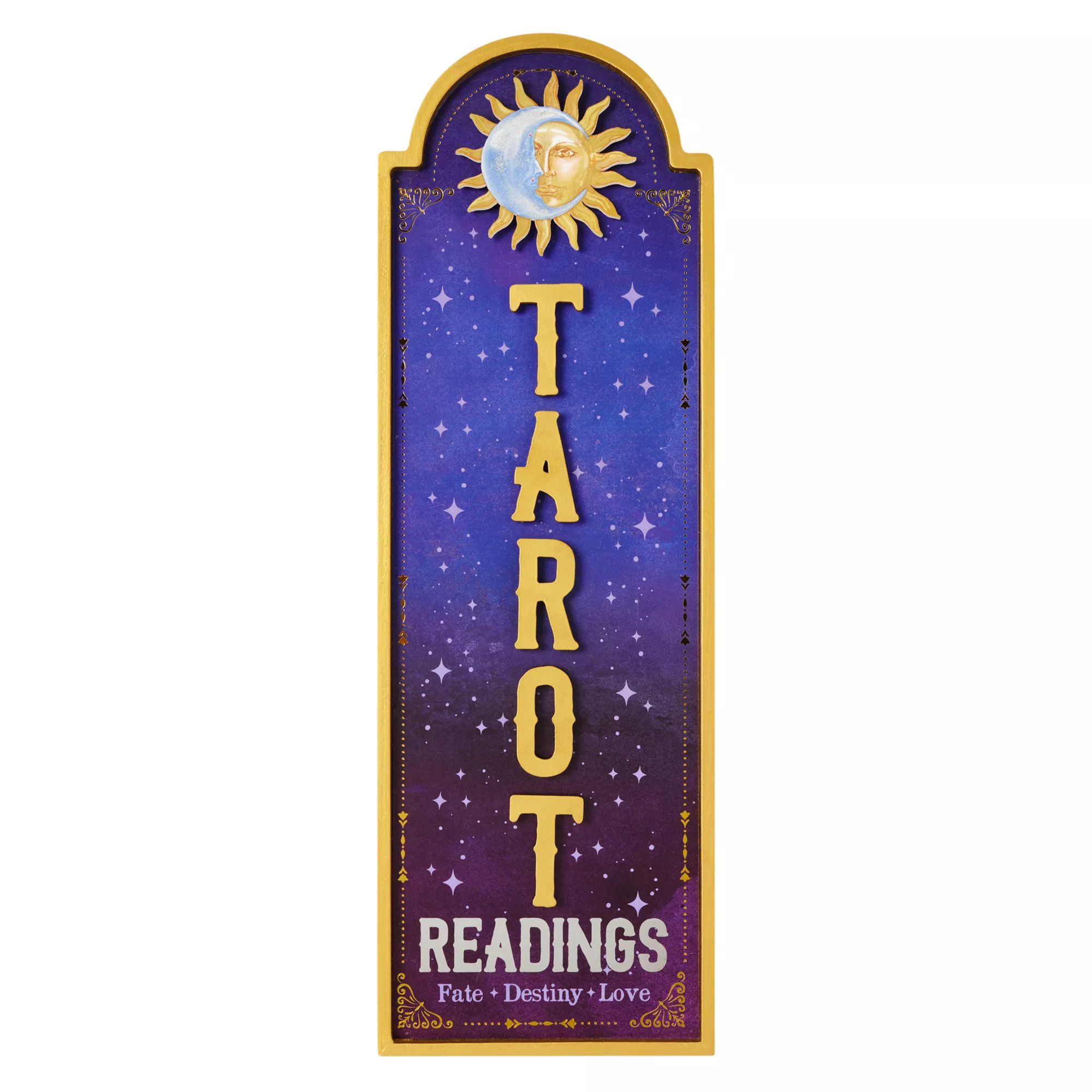Show that you're in tune with the spirits when you decorate with this Tarot Readings Sign! This celestial sign features bright purple and goldtone detailing sure to enhance any space you use to communicate with the spirits. Add this piece to your home and prepare for your next reading!