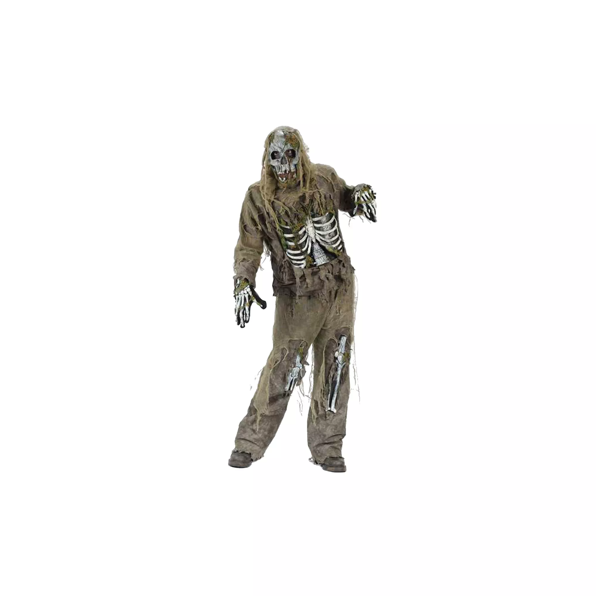 Walk like a zombie through the neighborhood or the party in this distressed Zombie Skeleton teen costume. The beige tattered shirt of this zombie costume features an exposed skeletal chest and comes complete with matching pants, black and white skeleton gloves along with an intricately detailed mask.