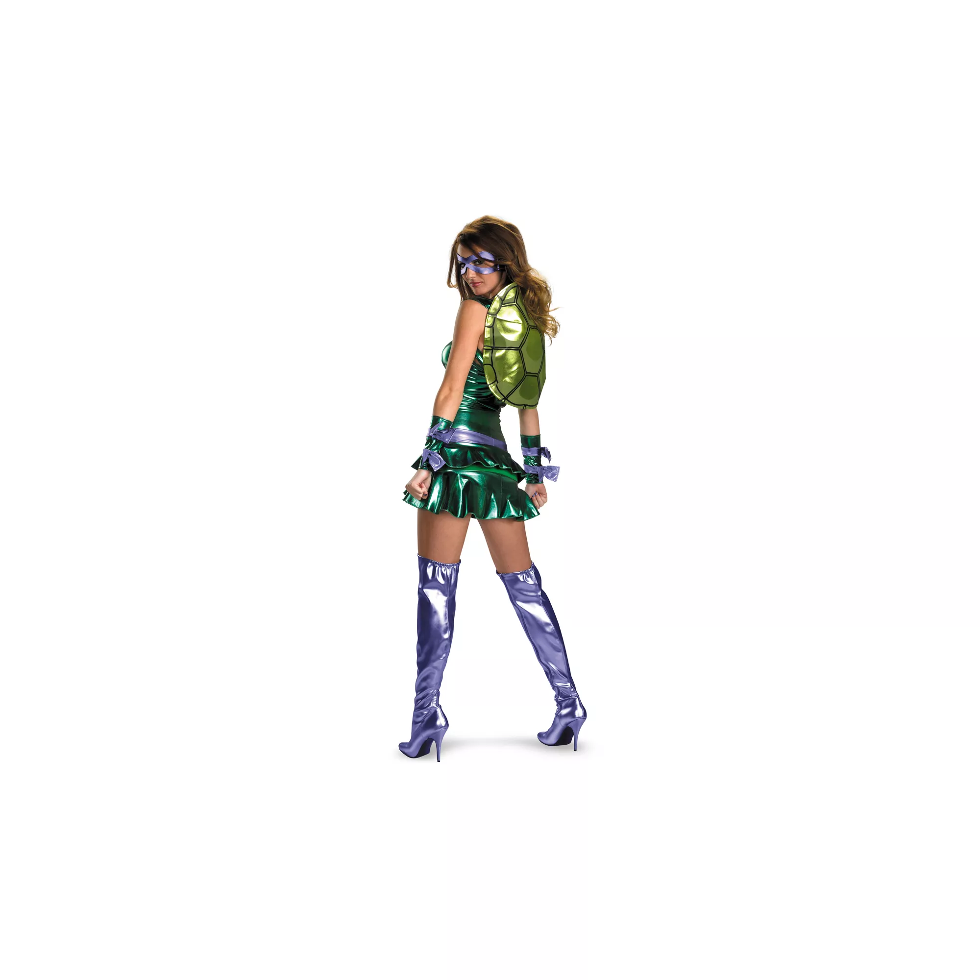 adult womens costume. Exercise your technical side when you wear the green, polyester/spandex blend dress, complete with turtle shell backpack and matching wristbands.