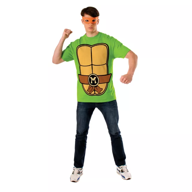 Be the fun-loving and goofy one of the bunch on Halloween when you wear this officially licensed Teenage Mutant Ninja Turtles Michelangelo T-Shirt and Mask. The screen printed tee features turtle body graphics and comes complete with an orange eye mask.