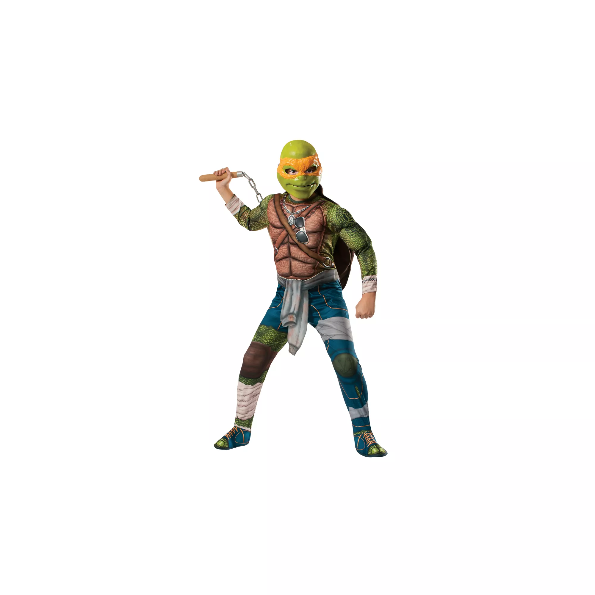 Have some crime-fighting fun this Halloween in the Officially Licensed Teenage Mutant Ninja Turtles Movie Michelangelo Child Costume. This free spirit is ready to roll in this muscled jumpsuit, shell backpack and orange masked turtle face.