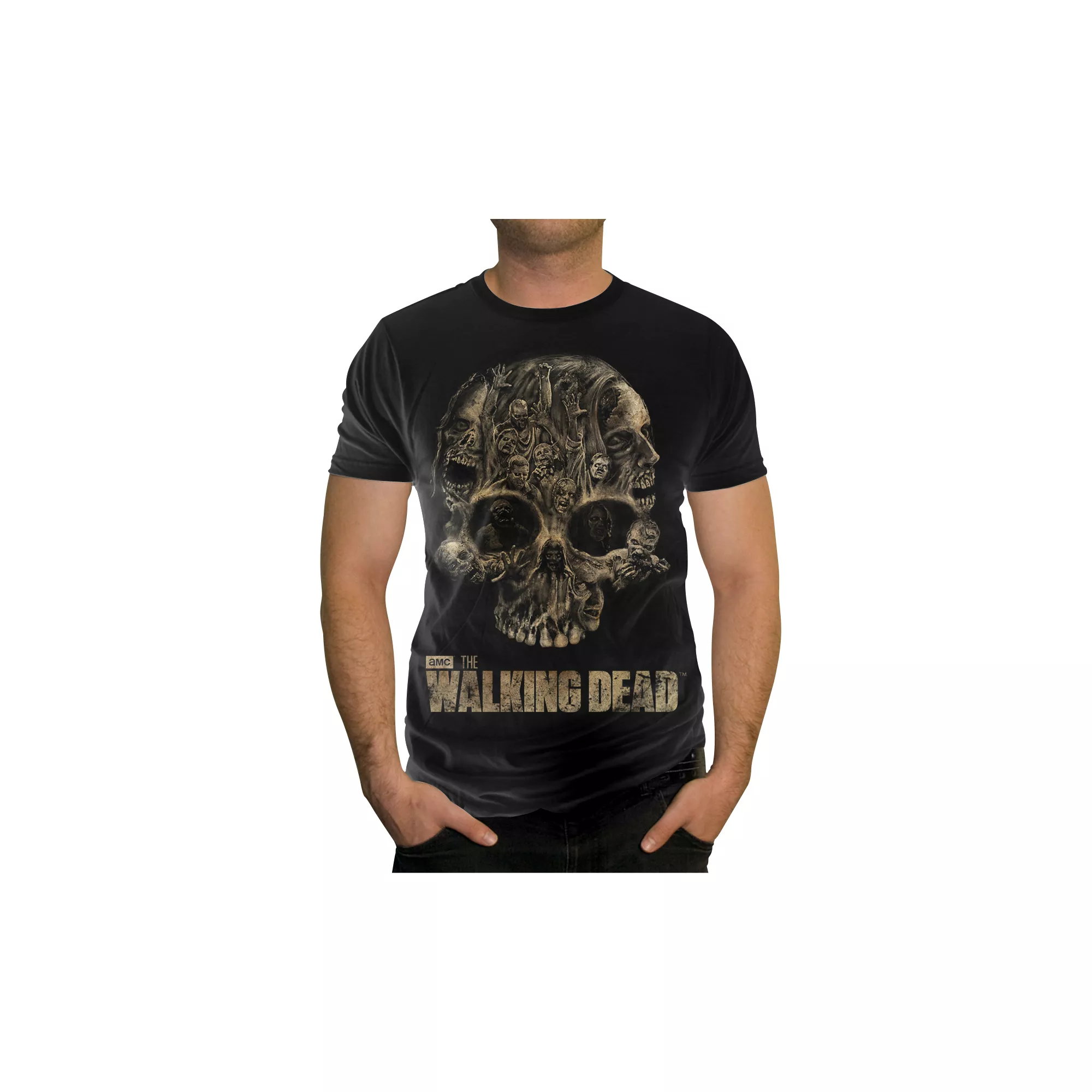 Fight the dead, fear the living when you wear the officially licensed The Walking Dead Skull T-Shirt. This black, cotton t-shirt features tan lettering and a skull graphic comprised of several zombie images.