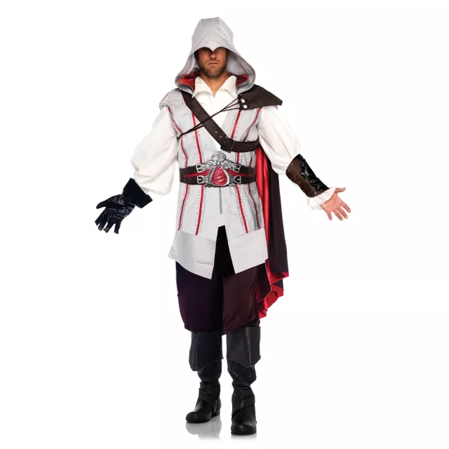 Seek revenge on those who killed your father and brothers when you wear this officially licensed Theatrical Assassins Creed Ezio Adult Men's Costume. You'll look just like this character in this white shirt with silver and red striped vest, maroon pants, elegant cummerbund, cape and belt. Carry your hidden blade (not included) in case of attack. This theatrical quality costume makes you look like you just jumped through the TV and into Halloween.