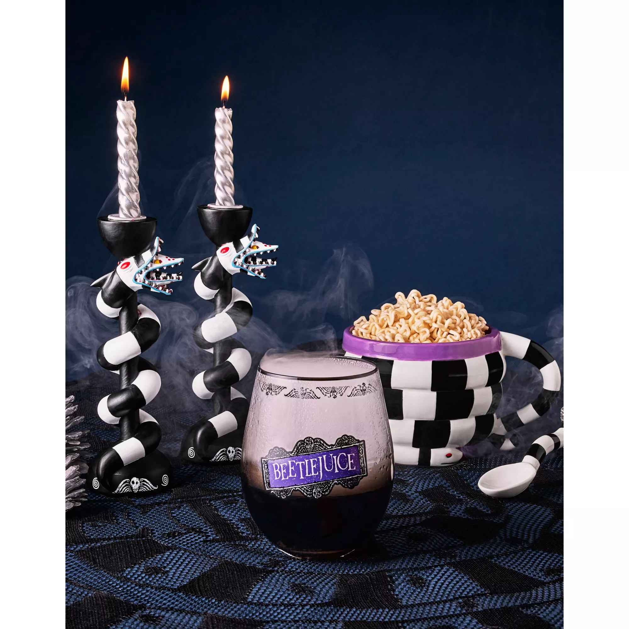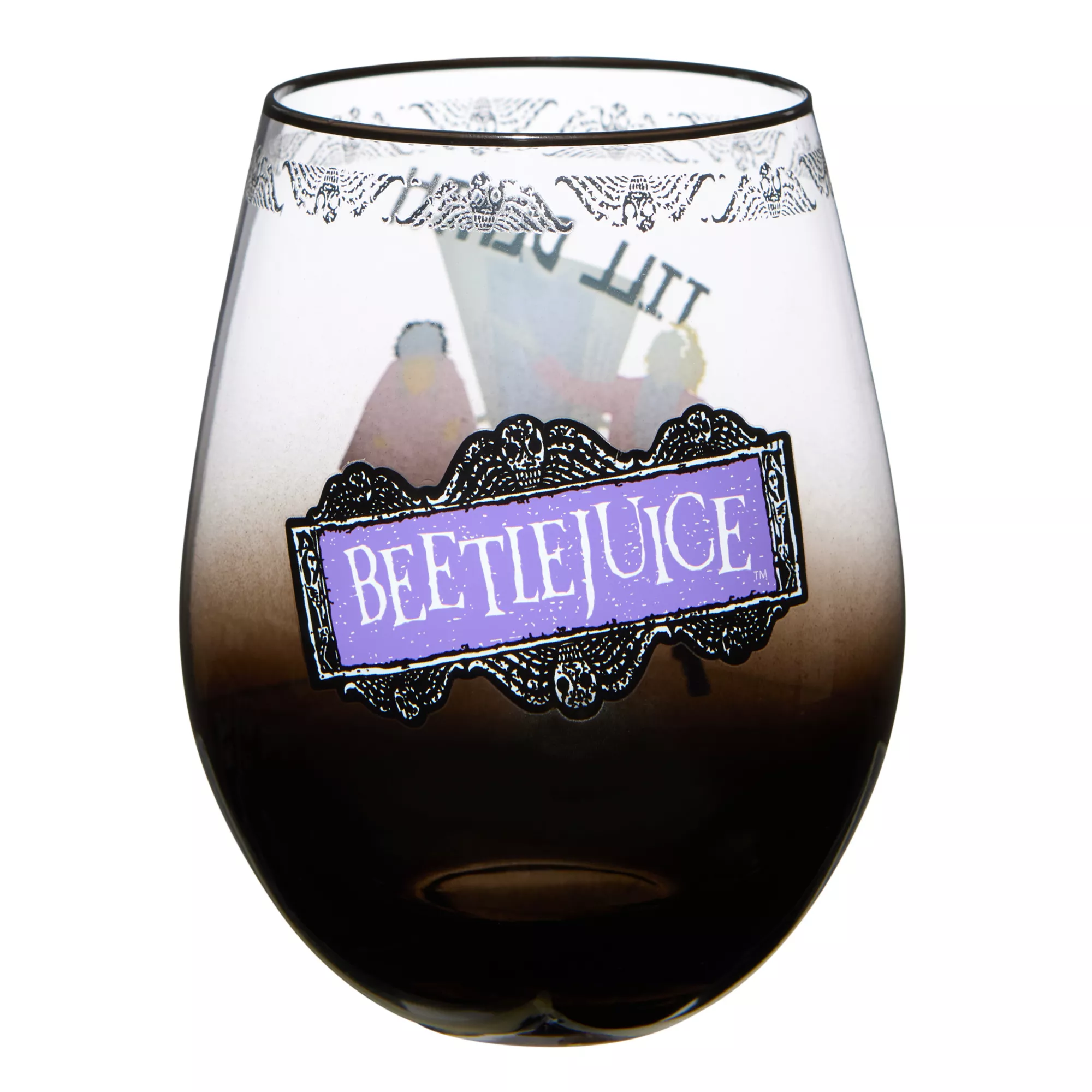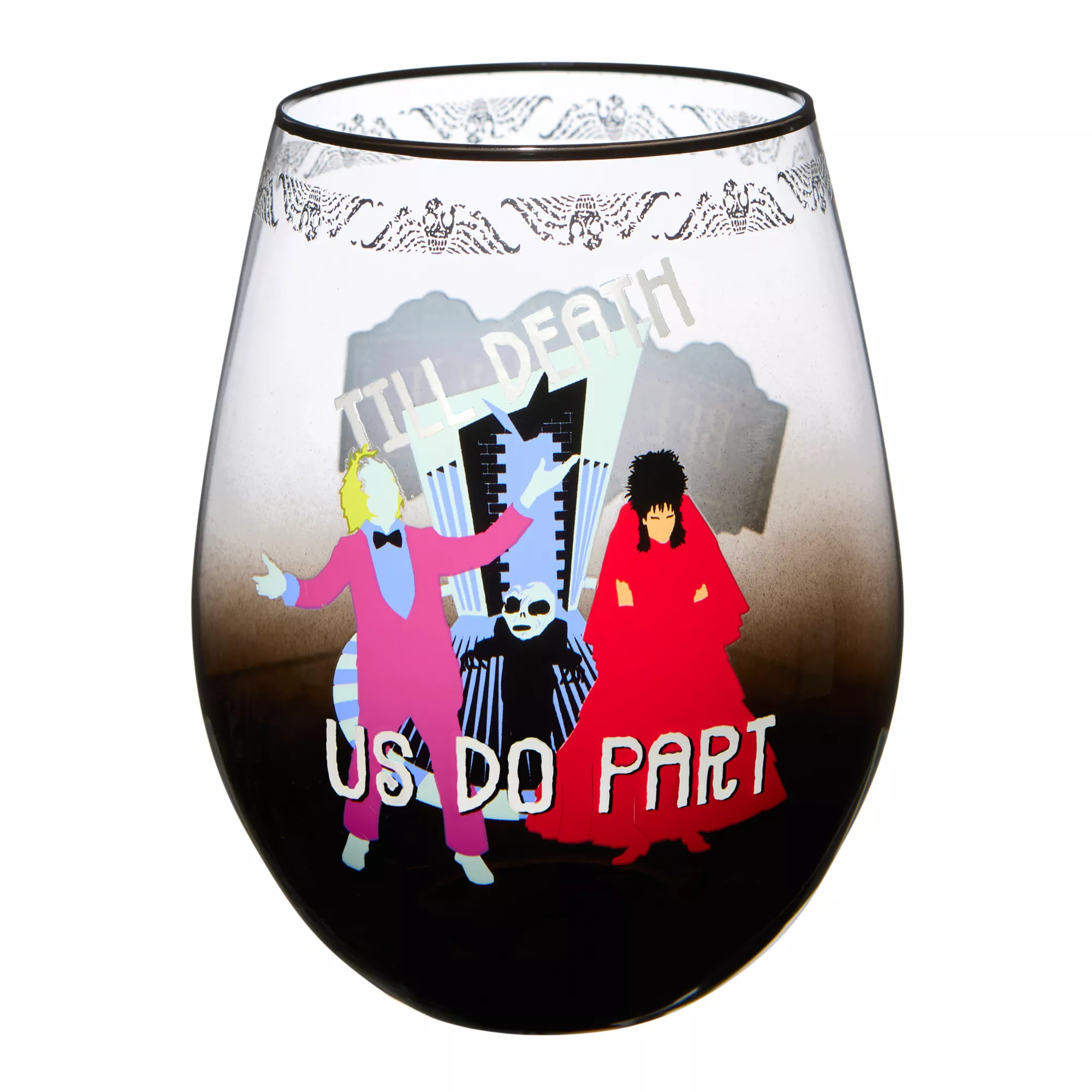 Grab a beverage with Beetlejuice with this spooky stemless glass! This officially licensed glass features Beetlejuice and Lydia Deetz in their wedding attire and the phrase "till death us do part." Cheers to your favorite movie with this ghoulish glass!