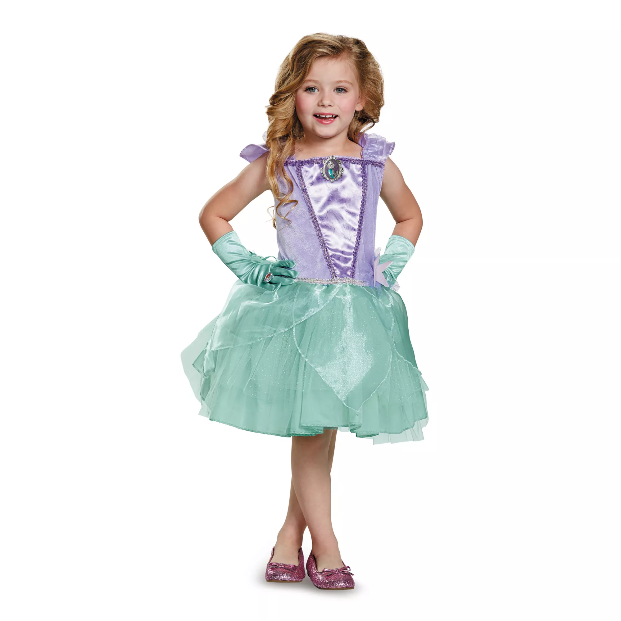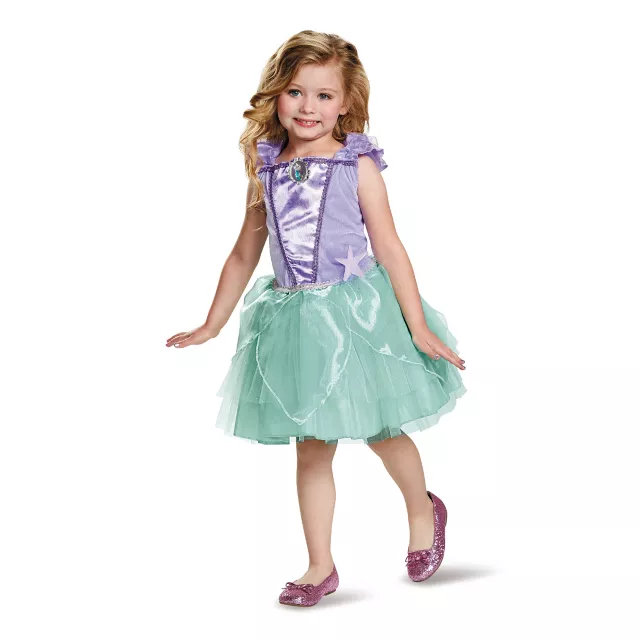 Add a fun twist to a classic Disney Princess with this Ariel ballerina costume! The fluffy tutu skirt and purple top with ruffled sleeves and character cameo will have your child ready for undersea fun!