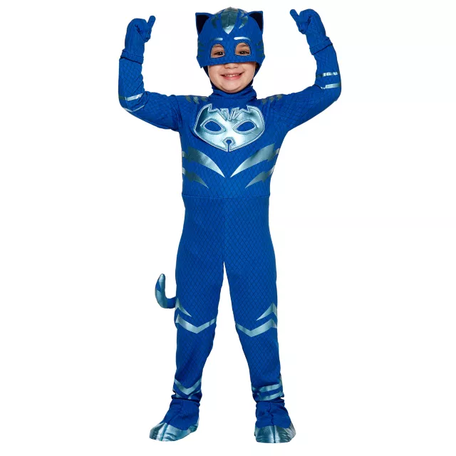 Ready to be a hero this Halloween? Your little one will be prepared to save the day in this officially licensed Catboy Costume, inspired by the hit show PJ Masks! Featuring a detailed blue jumpsuit with attached boot covers and a tail, a matching mask, and a pair of gloves, this set has everything your child needs to bring the character to life.