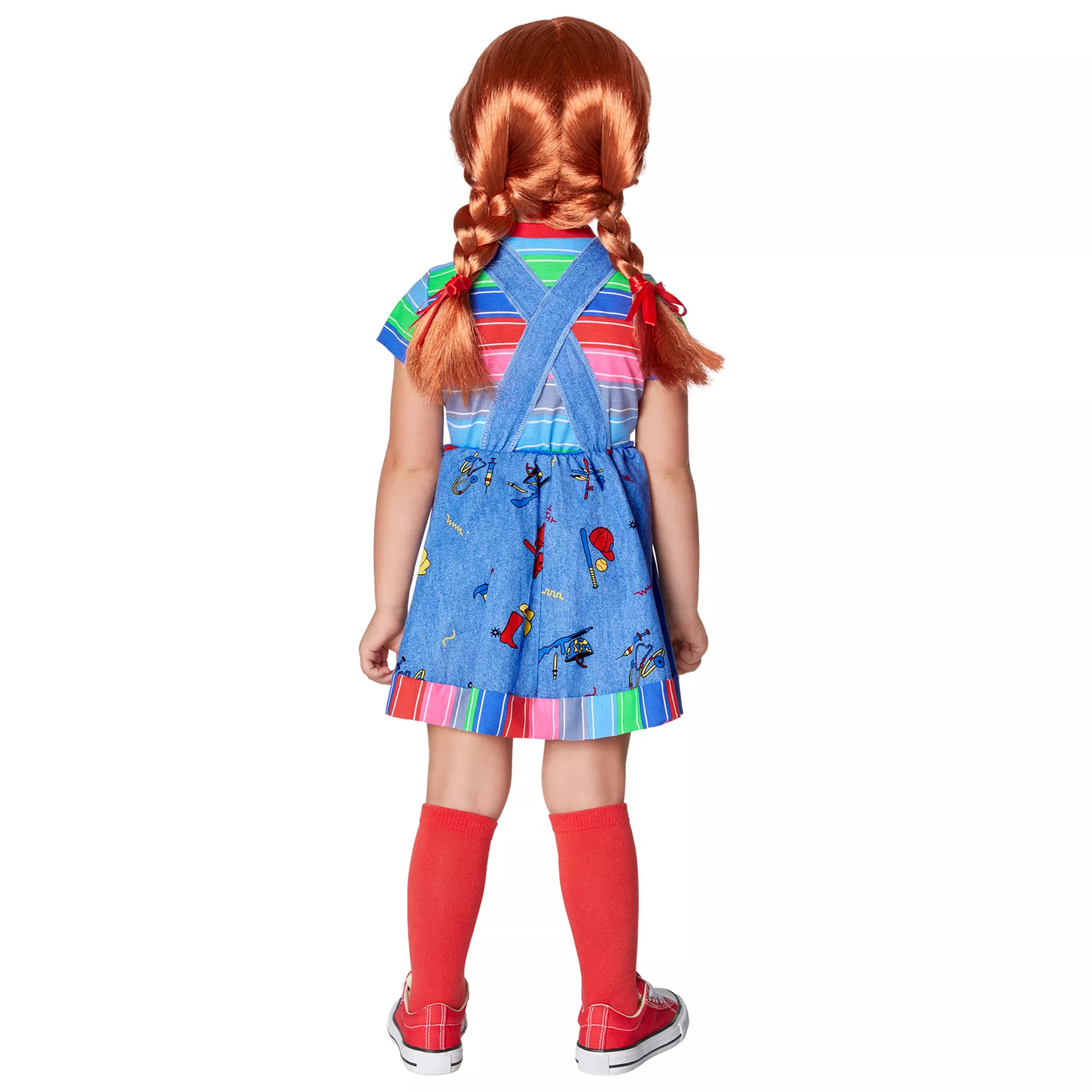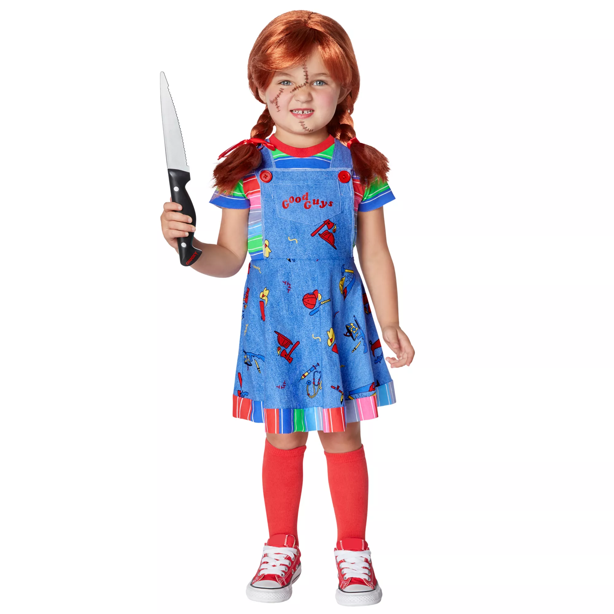 Your little one will be one of the good guys in this officially licensed Chucky costume! A striped ringer t shirt with an attached jumper looks just like Chucky’s favorite outfit. Top off the look with a red-haired wig with braids and a pair of knee-high socks. Time to get mischievous!