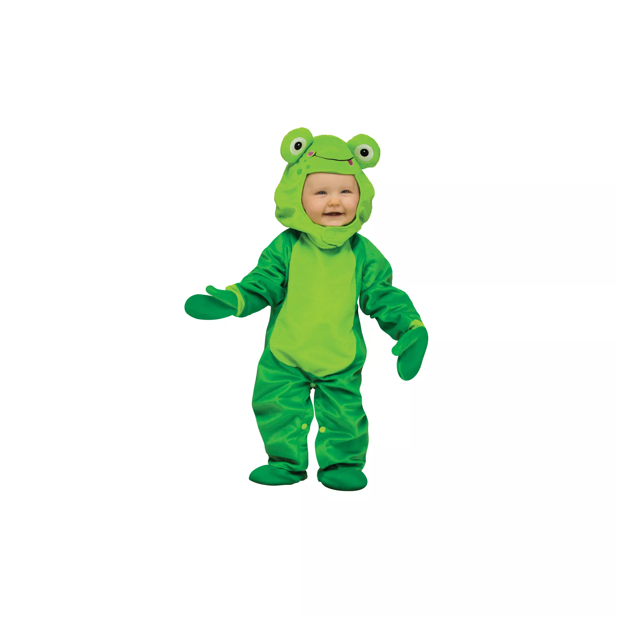 Your little tadpole will spring into Halloween in the Froggy Toddler Costume. This little jumper is king of the leaf pads in this green jumpsuit with frog faced hood.
