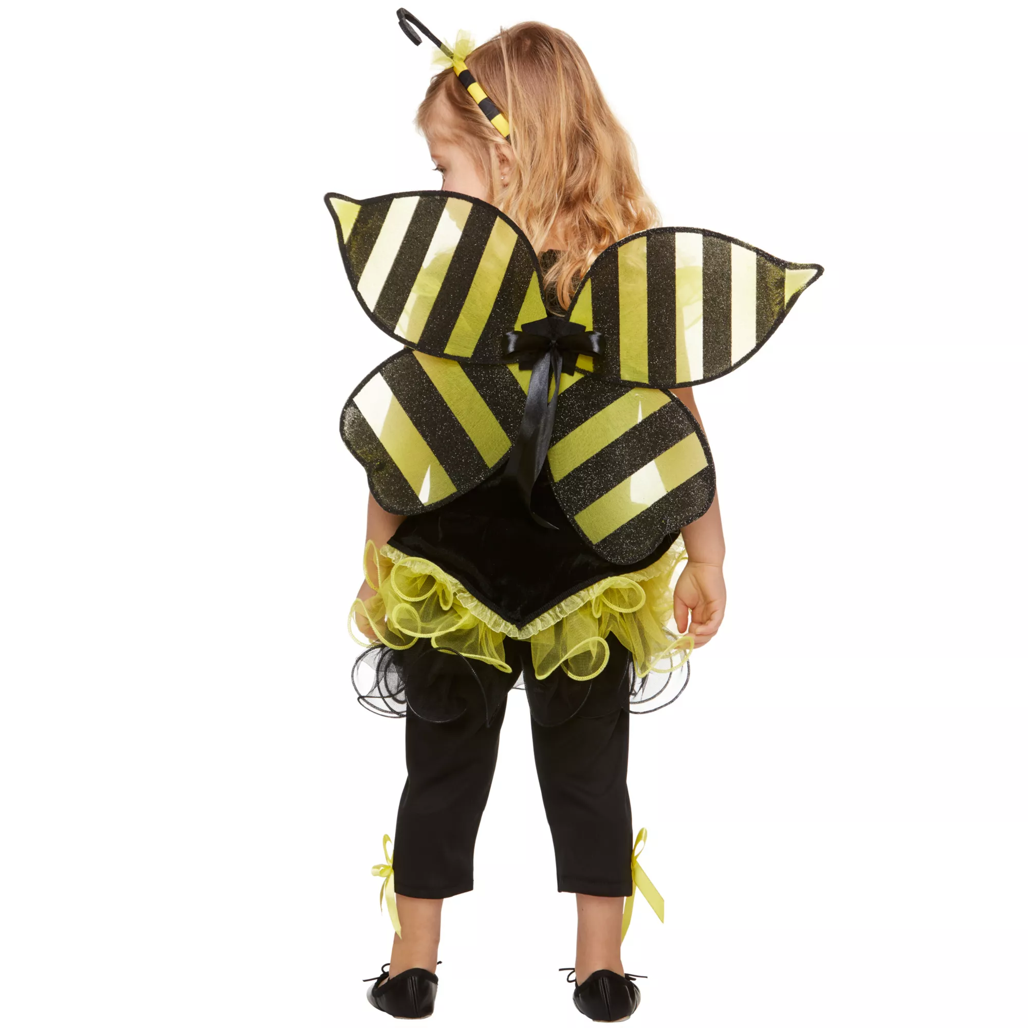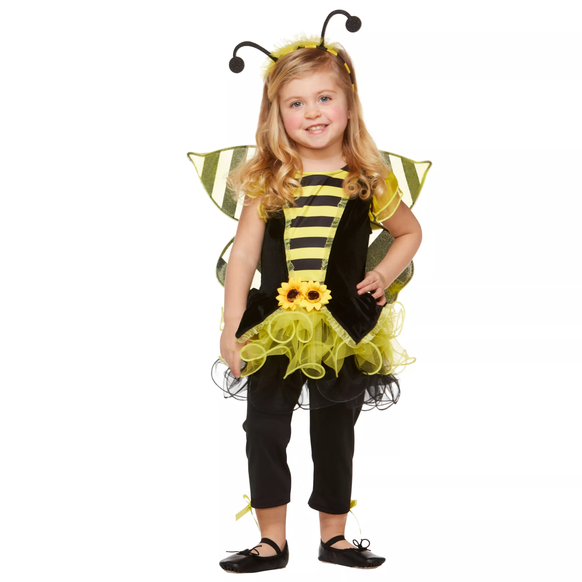 Your toddler will be buzzing with excitement all day long when you dress them up in this adorable bumble bee costume! The black and yellow dress features stripes down the middle, along with a ruffled skirt, sleeves, and sunflower detail. The included leggings and accessories gives you everything you need to transform your toddle into the cutest lil' bee around!