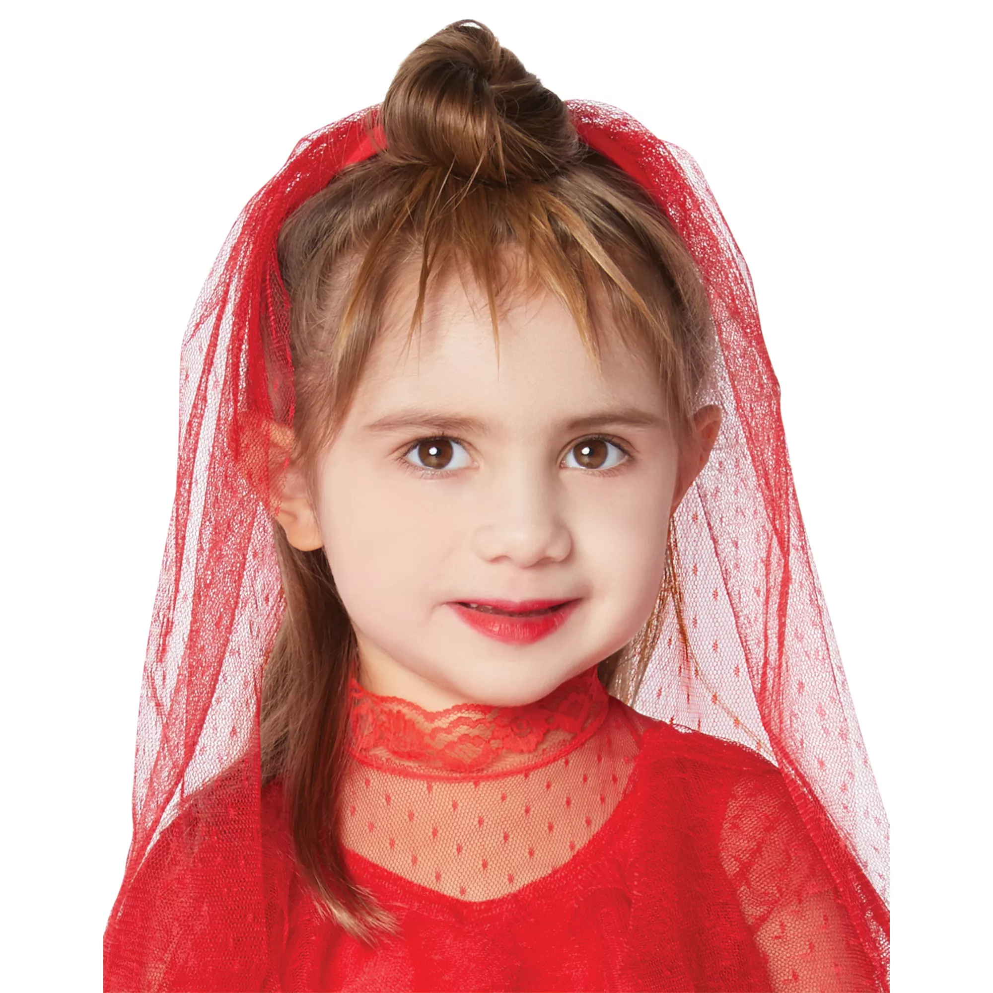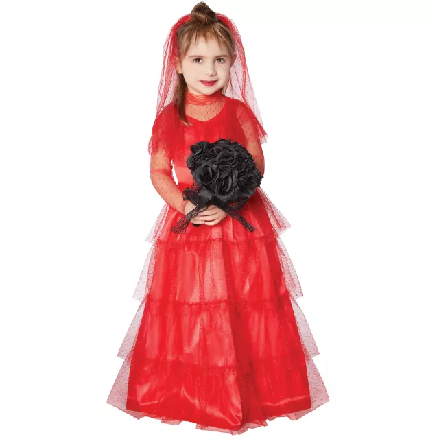 You look radiant in red! Step into this red Lydia Deetz costume to feel just like the bride of Beetlejuice. A high neck adorned with delicate lace adds stunning detail to this dress. Tiers of sheer ruffles line the bodice and skirt of this dress, adding tons of playful volume. Long, sheer sleeves and a matching clip-in veil make this costume pop. It's showtime!