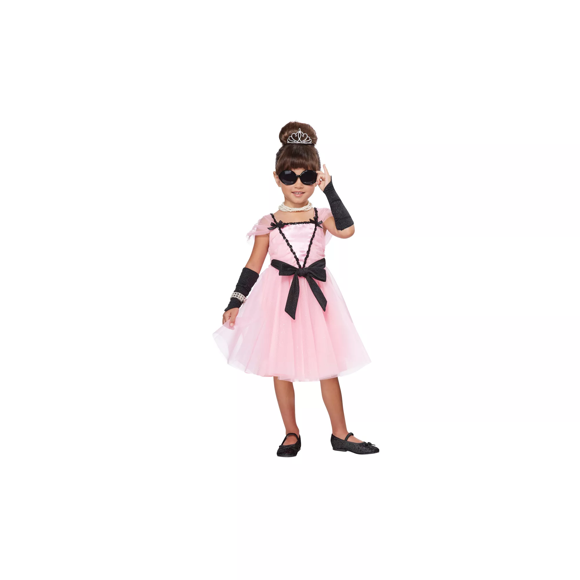Welcome, Little Miss Hollywood! The Movie Star Child Costume allows your little star to show off her attitude and glamorous side. Features light pink dress with big black bow accent, black glovelettes, sunglasses and a red carpet worthy tiara.