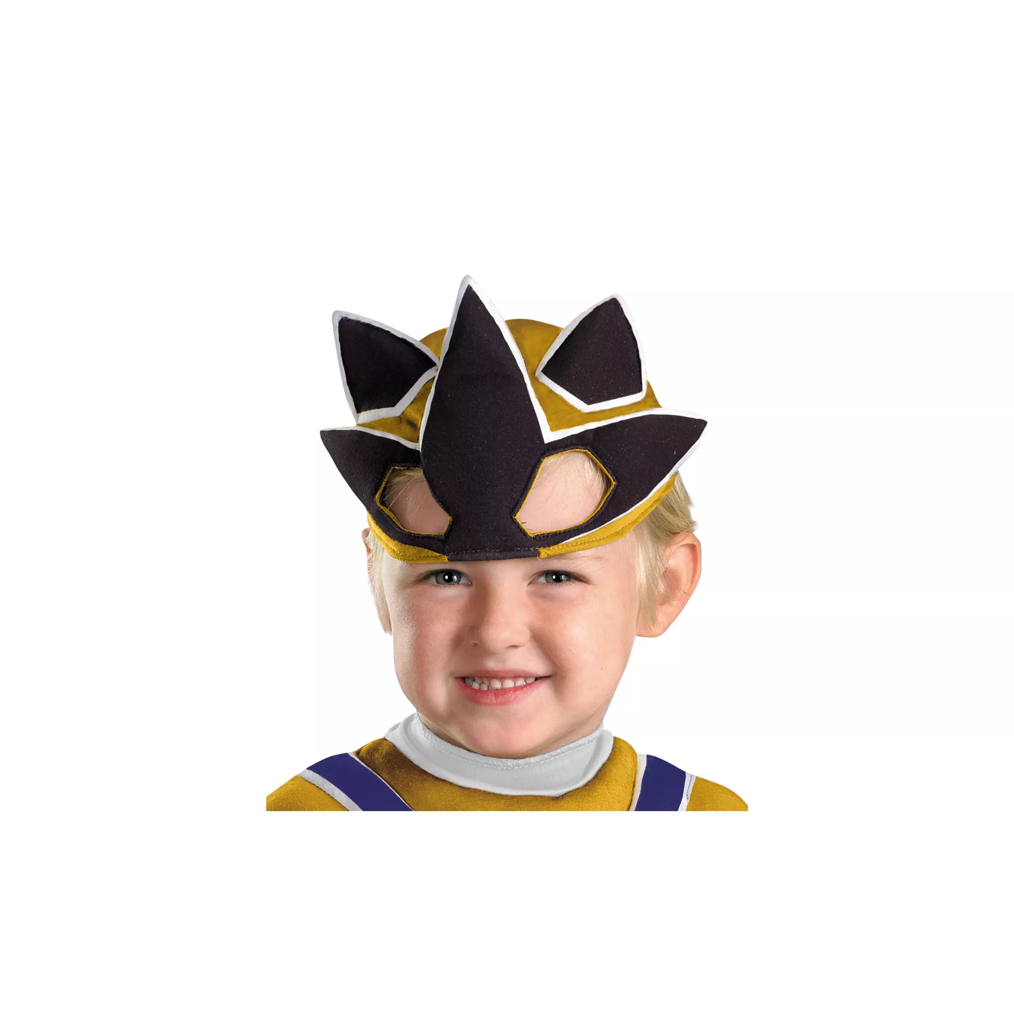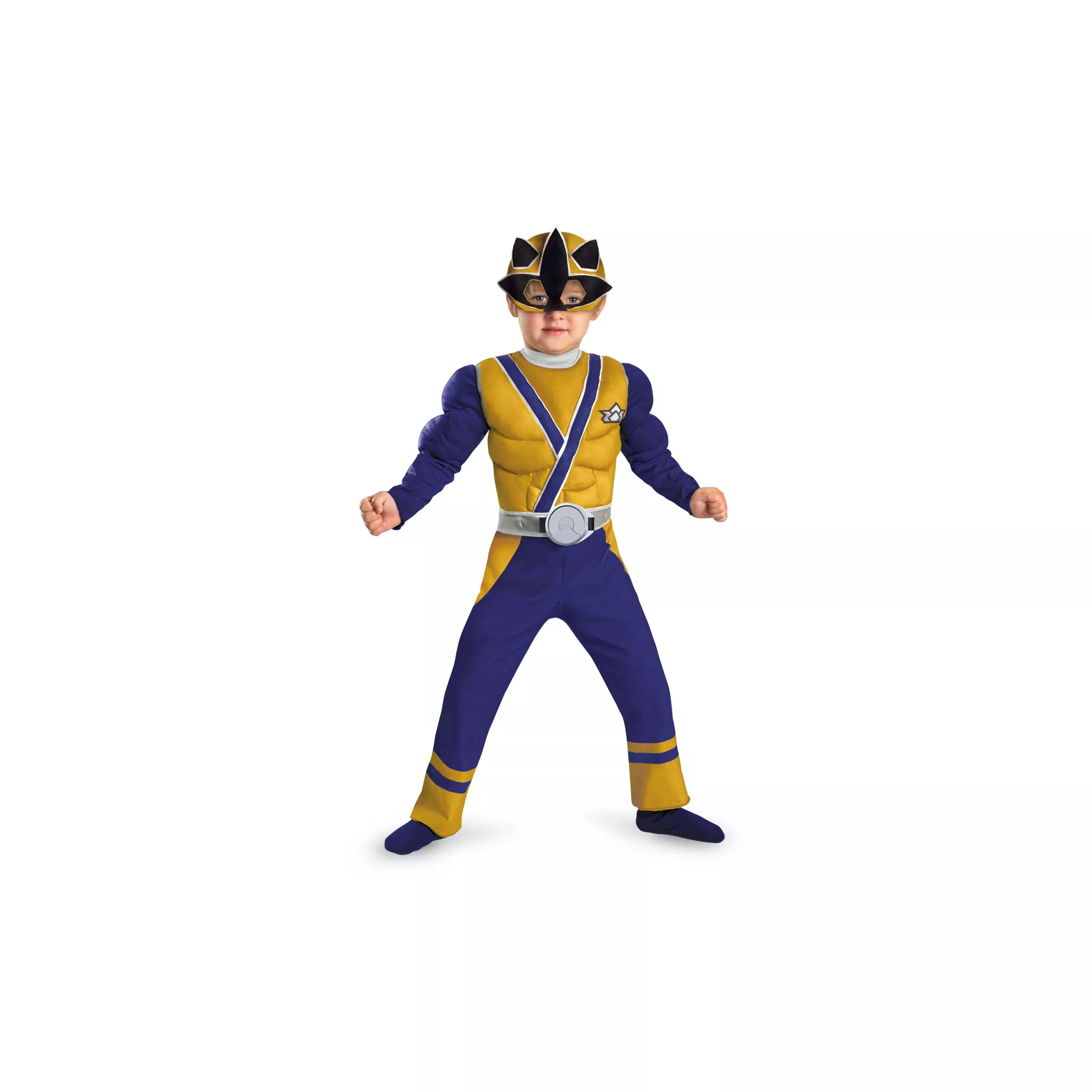 Allow your little samurai to test his skills on Halloween in this officially licensed Power Rangers Samurai Gold Ranger muscle toddler costume. This blue and gold character jumpsuit features padded chest and arms, attached belt with buckle, and soft character headpiece.