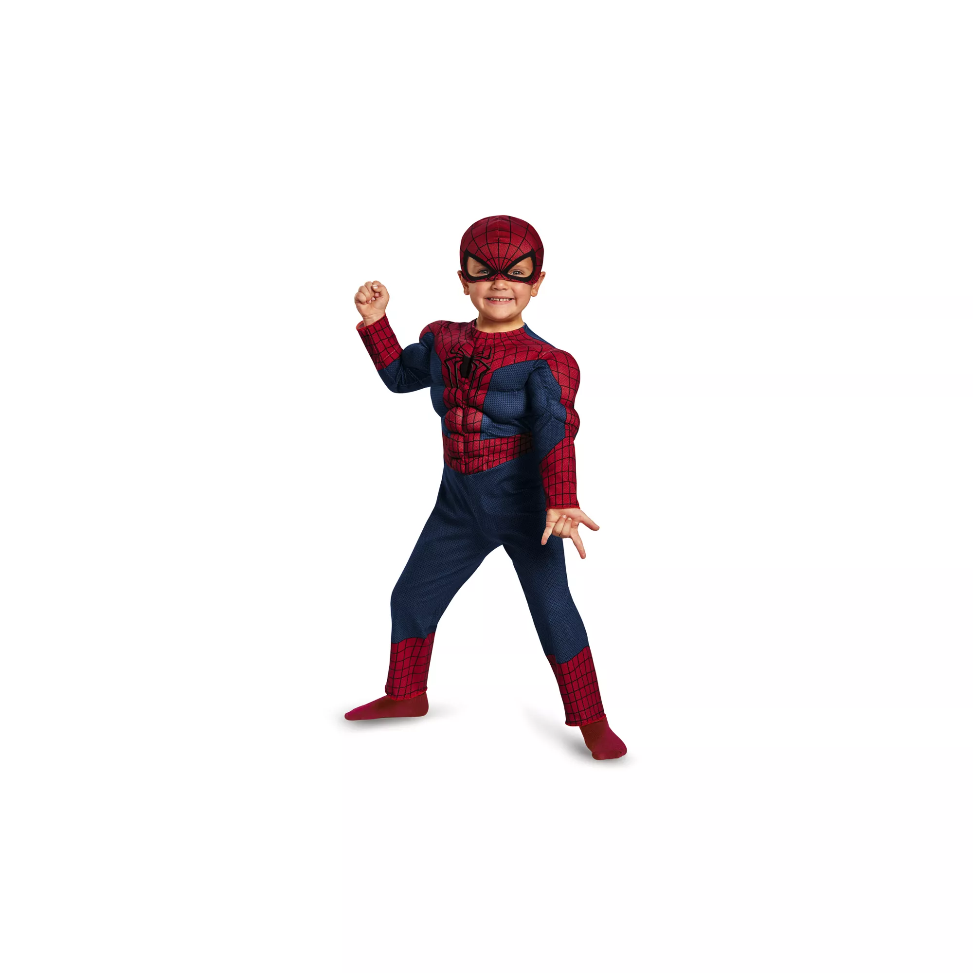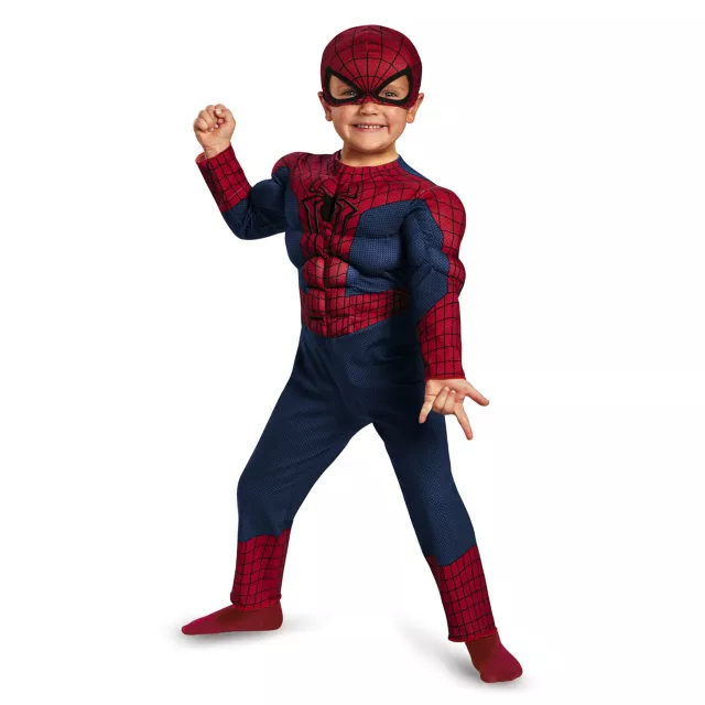 Shoot your web and swing into Halloween when you wear the officially licensed Spiderman Muscle Jumpsuit Toddler Costume. This red, blue and black jumpsuit features muscle torso and arms and comes complete with a character mask.