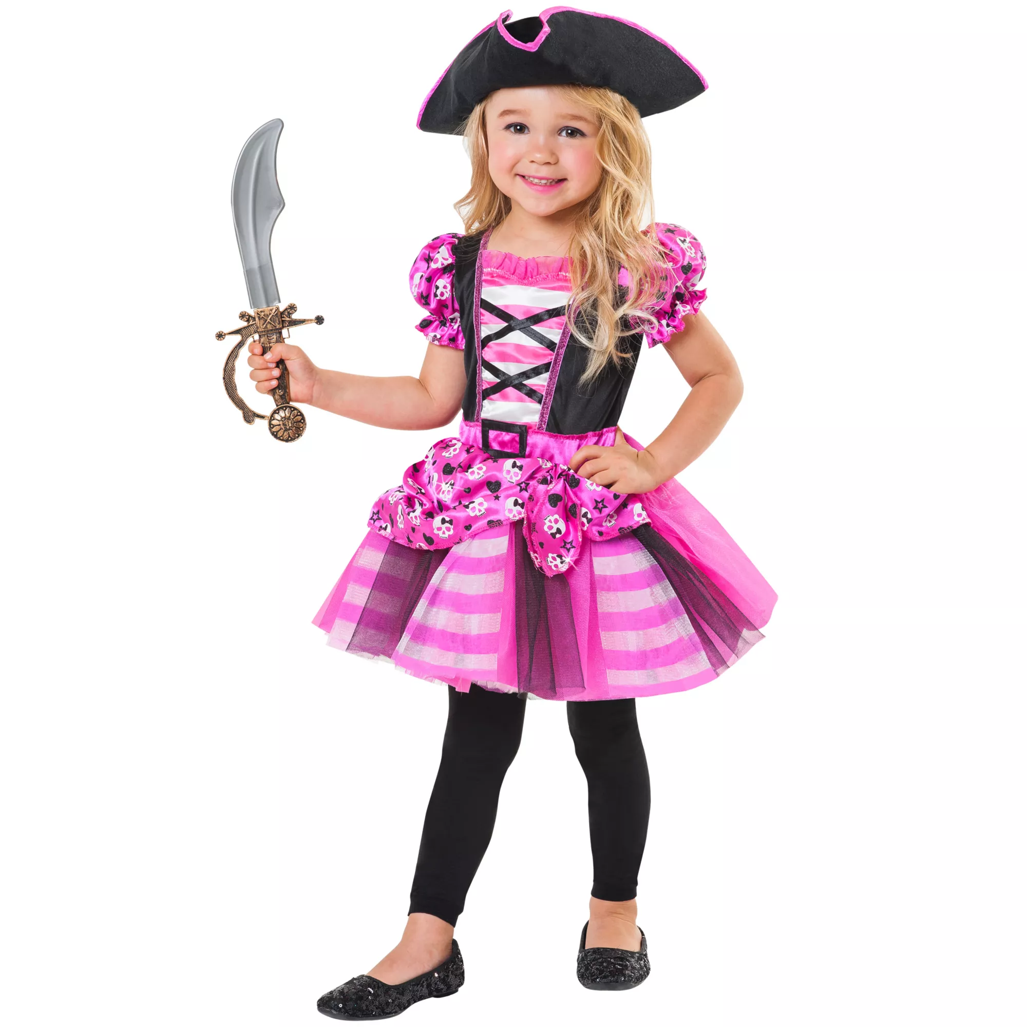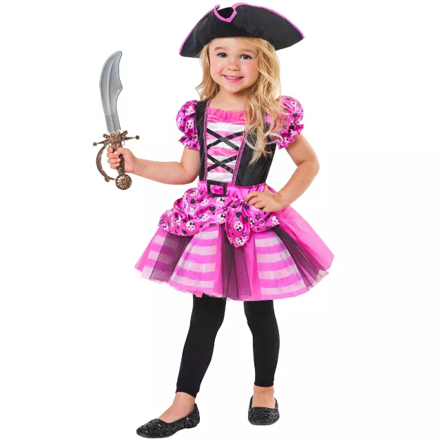 Arghh! Your little one will be ready to hoist the sails and head off to explore the seas in this pirate cutie costume! The bright pink dress features skeleton print details with black sheer trim. The included hat gives your child everything they need to be the perfect pirate!