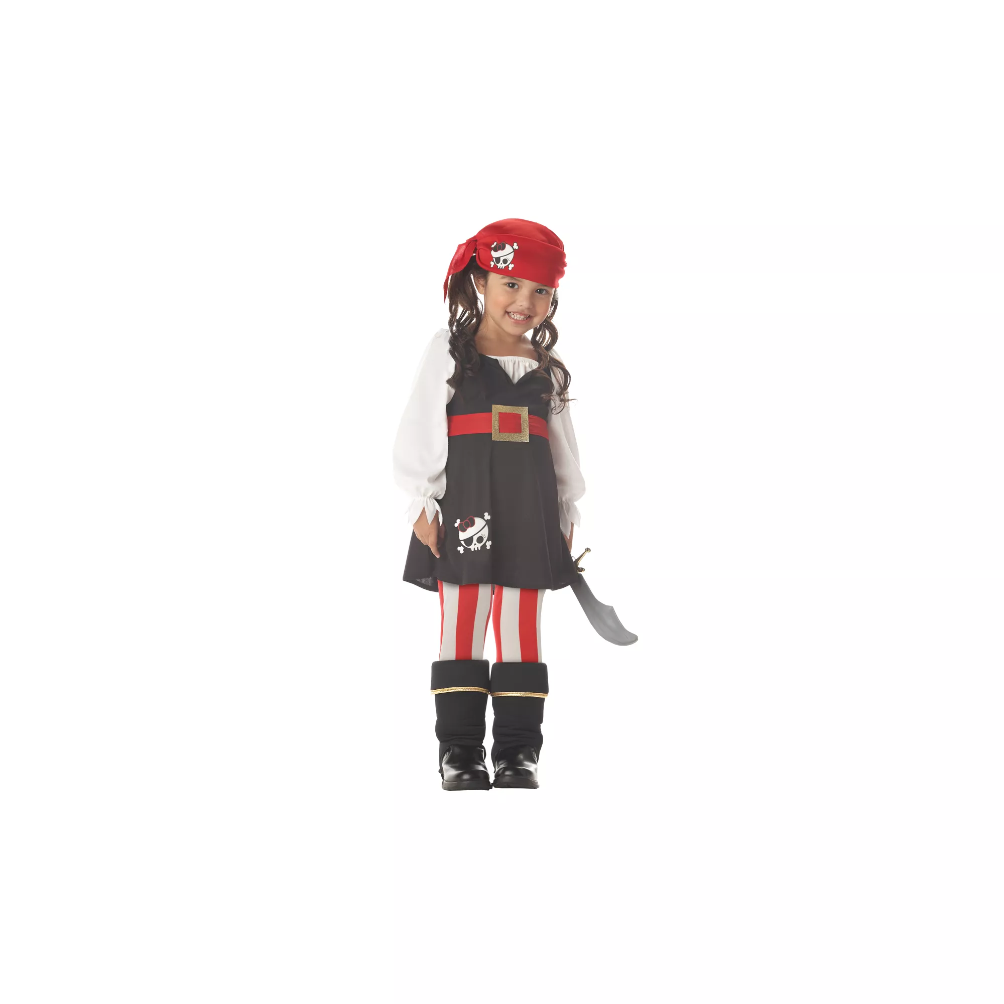 X marks the spot on the Precious Lil Pirate Child Costume! Your little pirate's happiness is a treasure in itself as they light-up over this adventure worthy pirate outfit, which includes a black dress with skull detail and white blouse detail which will keep her warm on any sea adventure. Ward off any enemies in style with the adorable bandana and matching striped tights-- this Halloween is as fresh as the salty sea air!