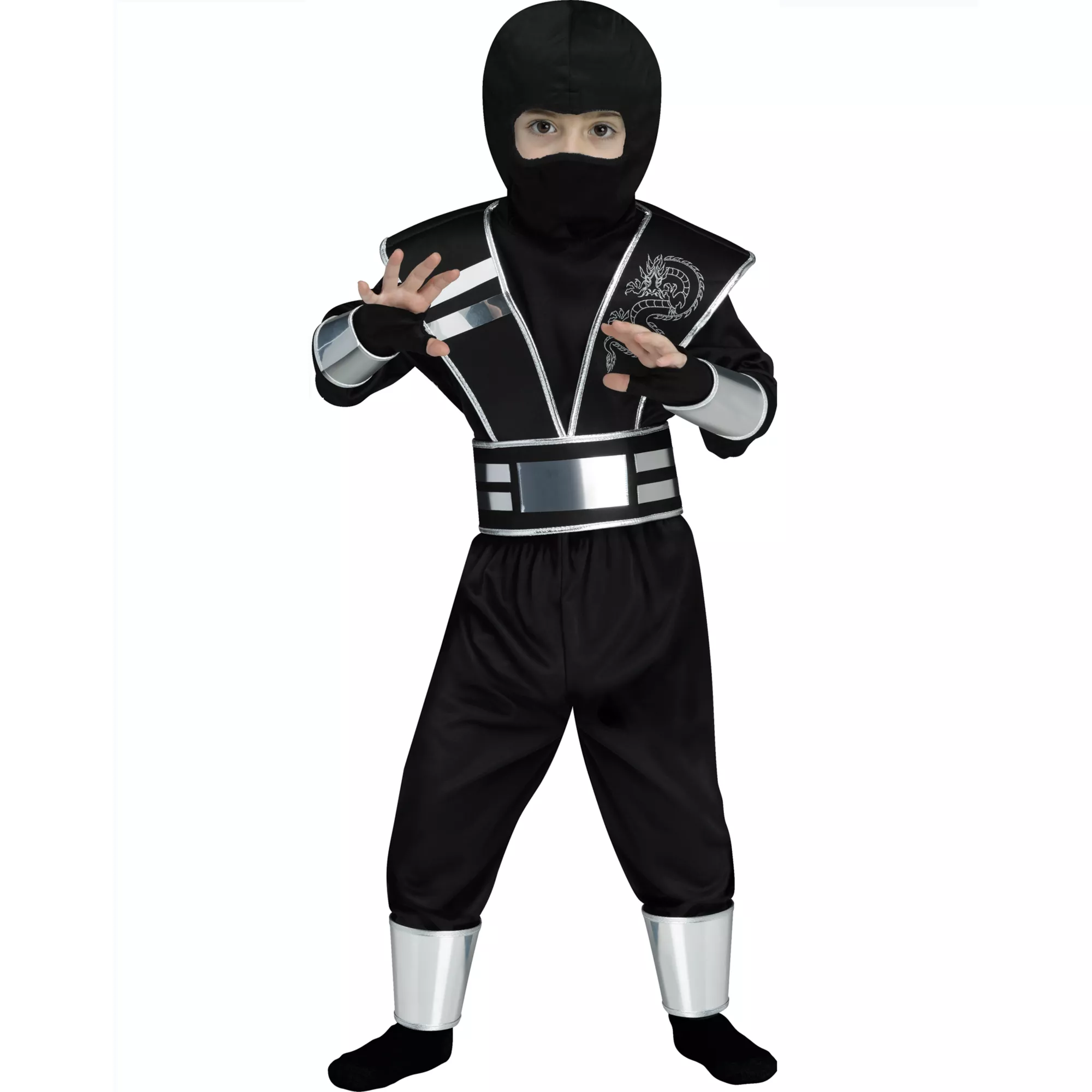 Your little ninja will show off their best karate moves in this silver mirror ninja costume! The silver dragon tunic sports shining mirror accents while the reflective visor mask is removable for improved vision. Your fighter will be looking as fierce as can be!