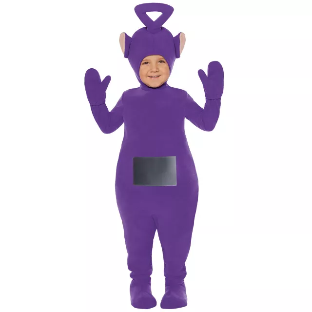 Dress up like Tinky Winky in this officially licensed toddler Teletubbies costume! This super-soft costume features a purple jumpsuit with a pretend screen attached to the belly. A purple hood and gloves complete this playful Teletubbies Tinky Winky style.
