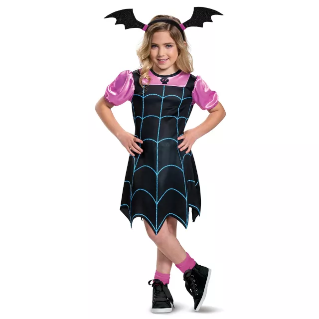 Welcome to the Scare B&B! Dress your little one up as her favorite Transylvanian vampire this Halloween! The printed dress features a handkerchief hem just like Vampirina's! Puff sleeves and included headband will have your little one looking like a bat in no time at all!
