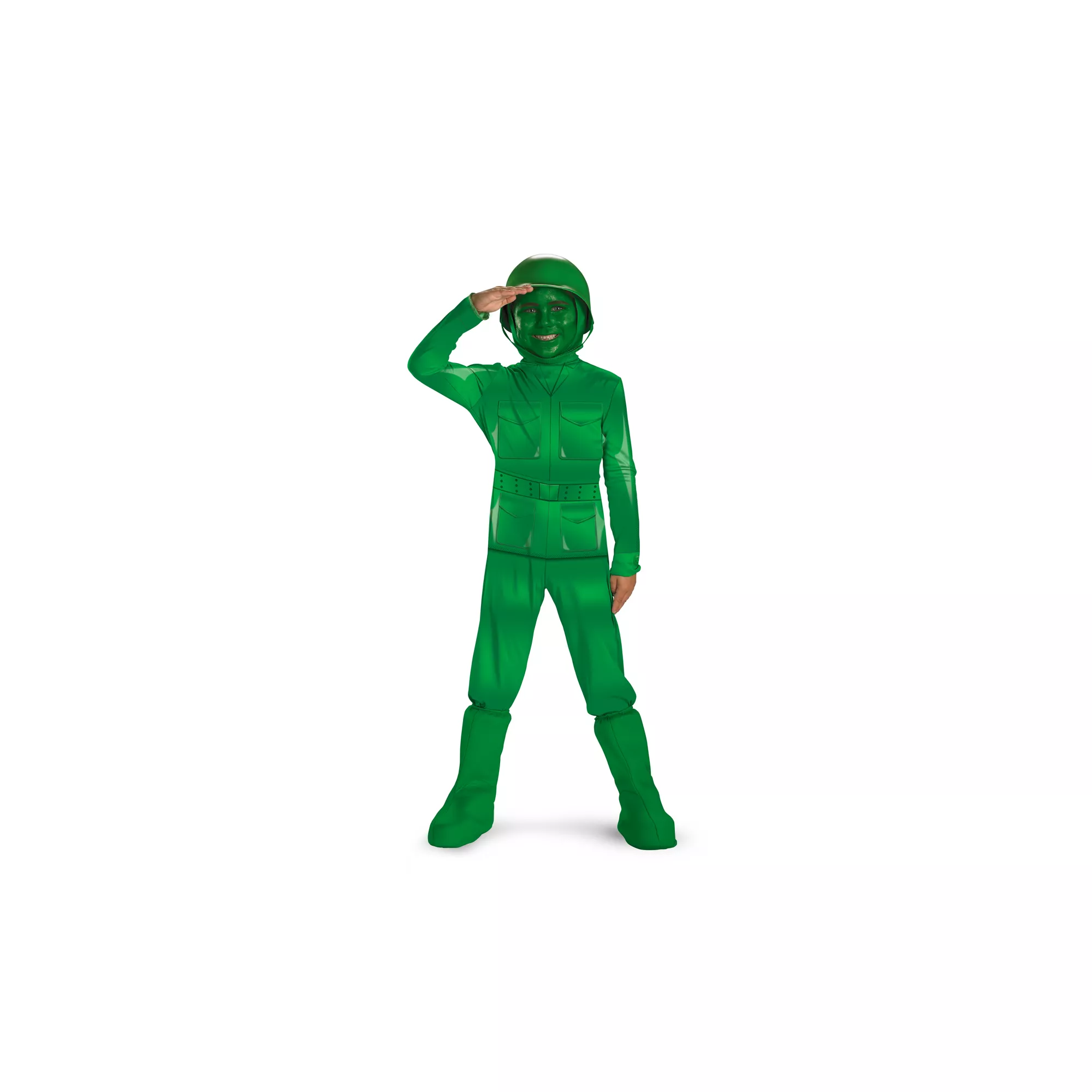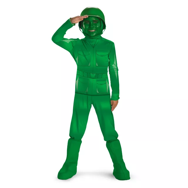 You melt them, run them over, bury them and blow them up. Now bring it all to life when you wear this officially licensed Toy Story Green Army Man child costume. The green, 100% polyester printed jumpsuit comes complete with a helmet, hood and boot covers.