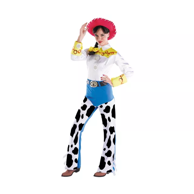 Bring a toy to life in this officially licensed Disney Toy Story Jessie Deluxe adult womens costume. The printed jumpsuit is styled to look like a shirt with attached belt, blue jeans, chaps, cuffs, matching cowboy hat and yellow hair bow.