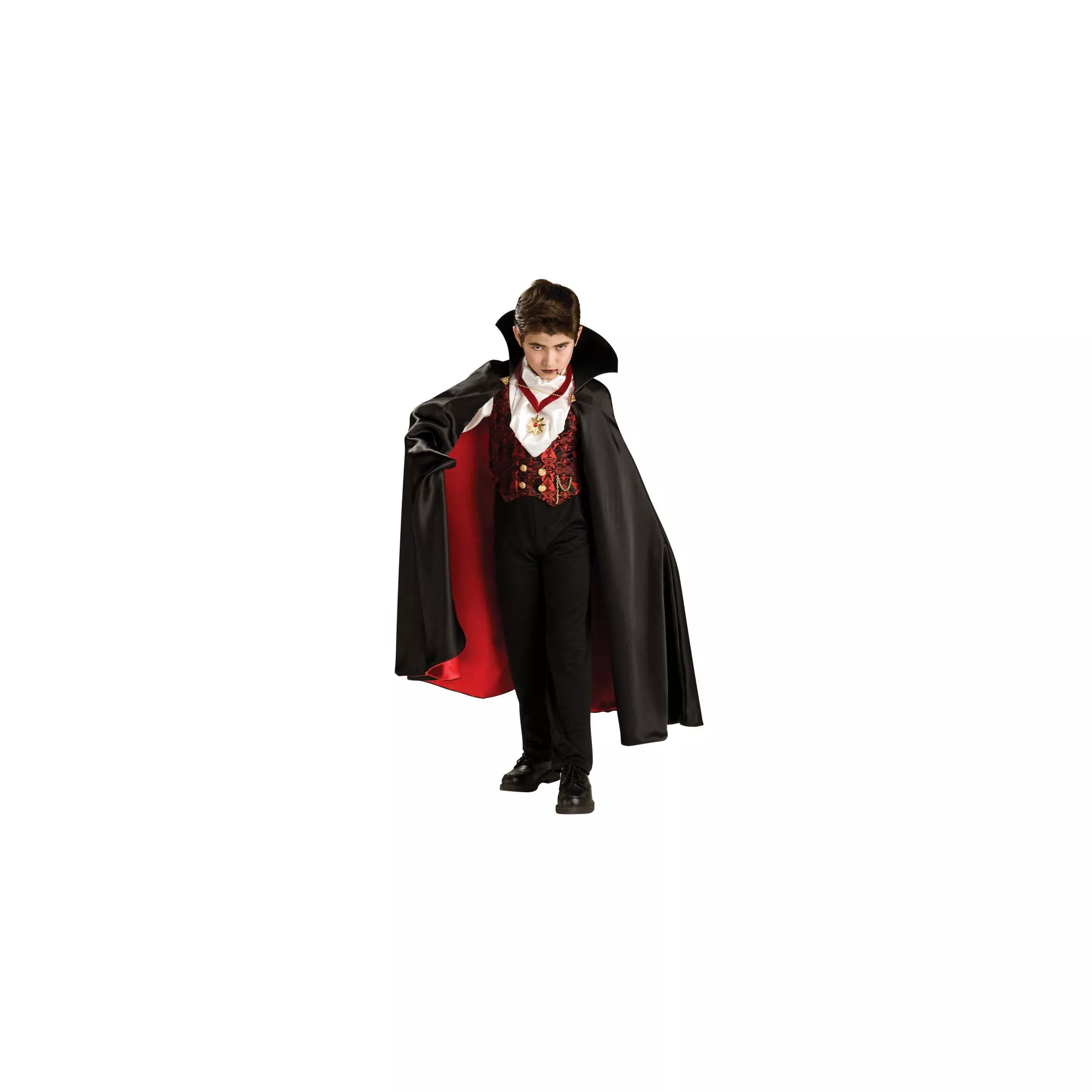 Sink your teeth into Halloween when you wear this Transylvania Vampire deluxe child costume. The black and red-lined, 100% polyester cape features a stand-up collar and comes complete with a red brocade vest with attached white period shirt, black pants and a Gothic medallion on a red ribbon.