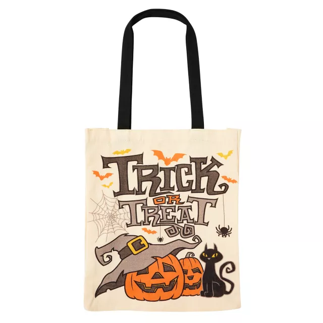 Get ready to fill this Trick or Treat Canvas Tote with candy on Halloween night! The canvas tote features candy corn graphics in the background and "Trick or Treat" in black in the middle.