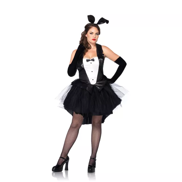 Even cute little furry animals dress up for special occasions like Halloween! Tux and Tails Bunny Adult Womens Plus Size Costume includes shimmery pleather collared tux print top, attached frilly mesh high-low skirt, attached tail and curled bunny ear headband.