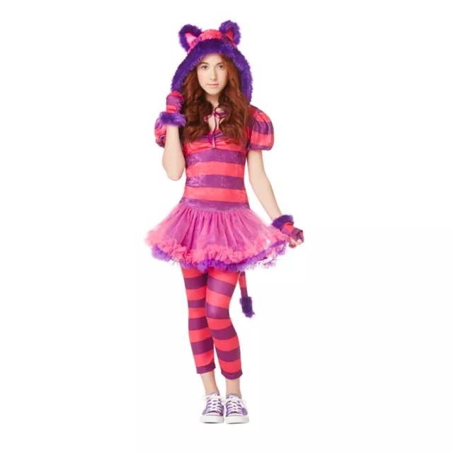 Let your identity disappear when you transform in this Cheshire Cat Tween Costume! Help Alice on her adventure in this tank dress with attached pink and purple tutu and long tail. Accent this costume with the included furry hooded bolero featuring car ears, fingerless gloves with purple fur accents, and matching striped footless tights. Keep grinning and you will have a great time trick-or-treating in this fun and fluffy costume!