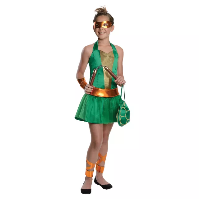 You won't be hanging out in the sewers wearing this officially licensed Teenage Mutant Ninja Turtles Michelangelo Tween Costume so you better practice your martial arts! Shiny green character dress with gold detail, matching mask, gauntlets and shell purse will make you one ultimately stylish crime fighter.