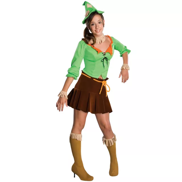 Be the brains of this officially licensed Wizard of Oz Scarecrow tween costume. The green, brown, beige and orange shirt is accompanied by a choker, skirt, hat, boot tops and wristlets. Get the girls to go as the Cowardly Lion and the Tin Man for a fun group costume.