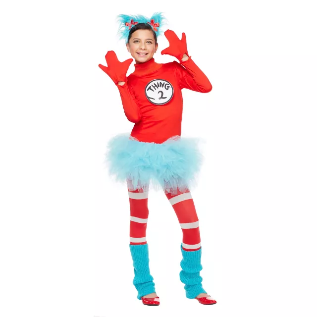 Here comes trouble, times double! Cause some troubling fun this Halloween in theOfficially Licensed Tween Thing 1 and 2 Tutu Costume - Dr. Seuss. Features a red and blue tutu dress, fun fuzzy hair band, blue leg warmers and striped leggings.