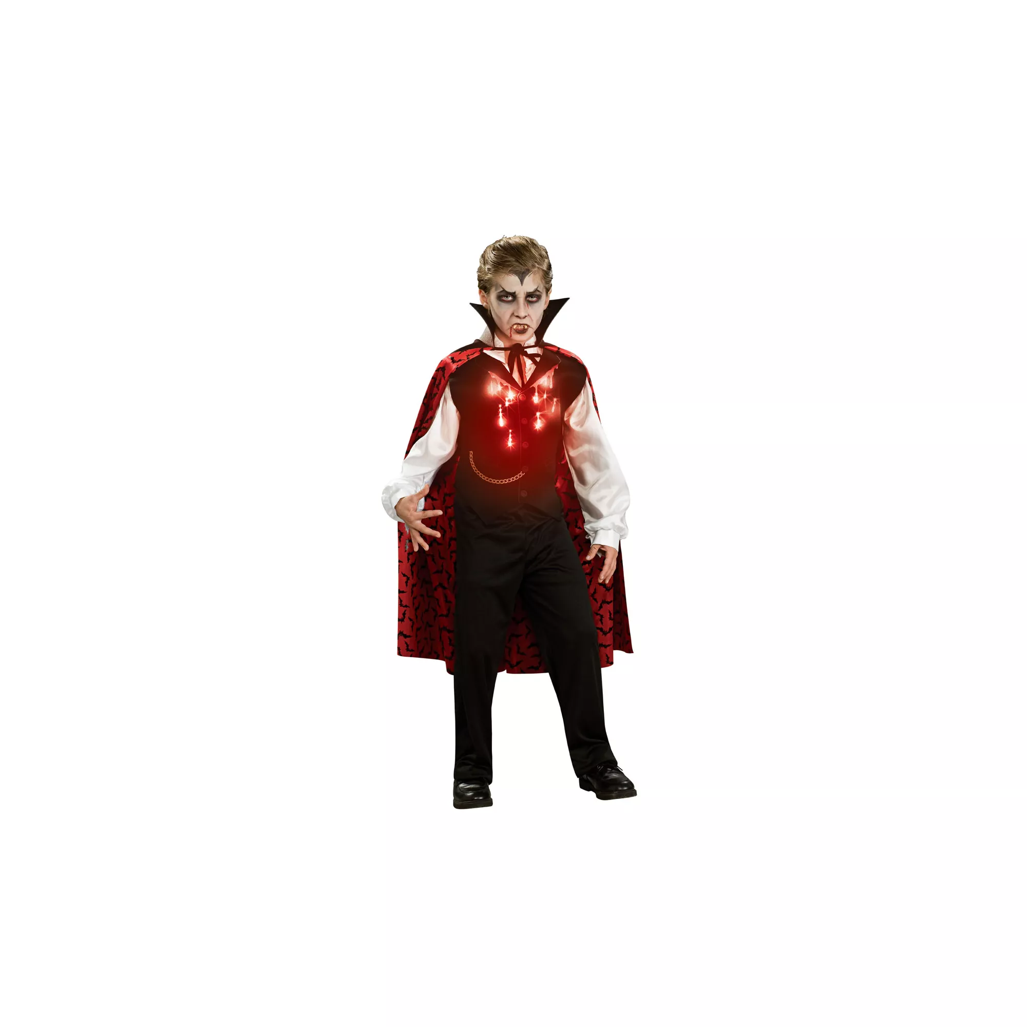 Take a bite out of Halloween when you wear this Vampire Fiber Optic child costume. The fiber optic light-up vest of this vampire costume comes complete with a cape and collar, pants and a shirt.