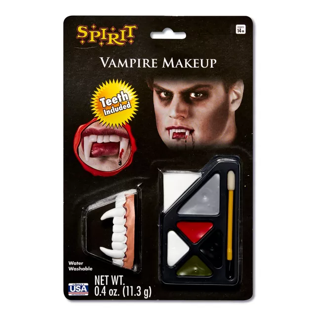 Complete any Vampire costume with this Vampire Makeup Kit. This makeup kit includes fangs, a sponge, a brush, and black, red, and grey cream makeup.