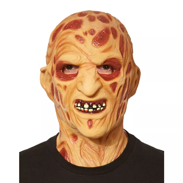 Scare them psychopath-style in this freaky Freddy Krueger overhead mask! This classic character mask is a highly-detailed latex replica of the frightening face of the Nightmare on Elm Street horror film villain. To get the total terrifying look, add Freddy's brown hat and sweater.