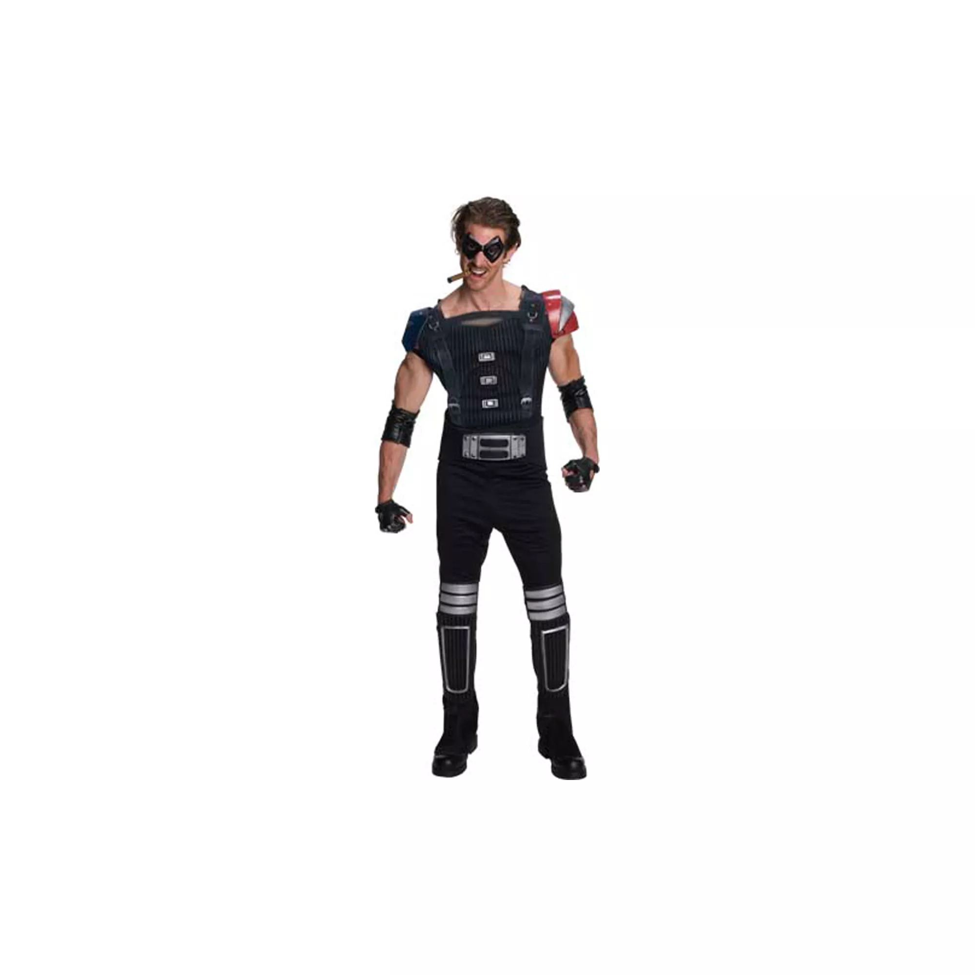 Kill them with laughter when you wear this authentic and officially licensed Watchmen Comedian adult mens costume. The black and silver muscle chest jumpsuit features attached boot tops and molded pieces, complete with a black character eye mask, silver and black belt along with black gloves.