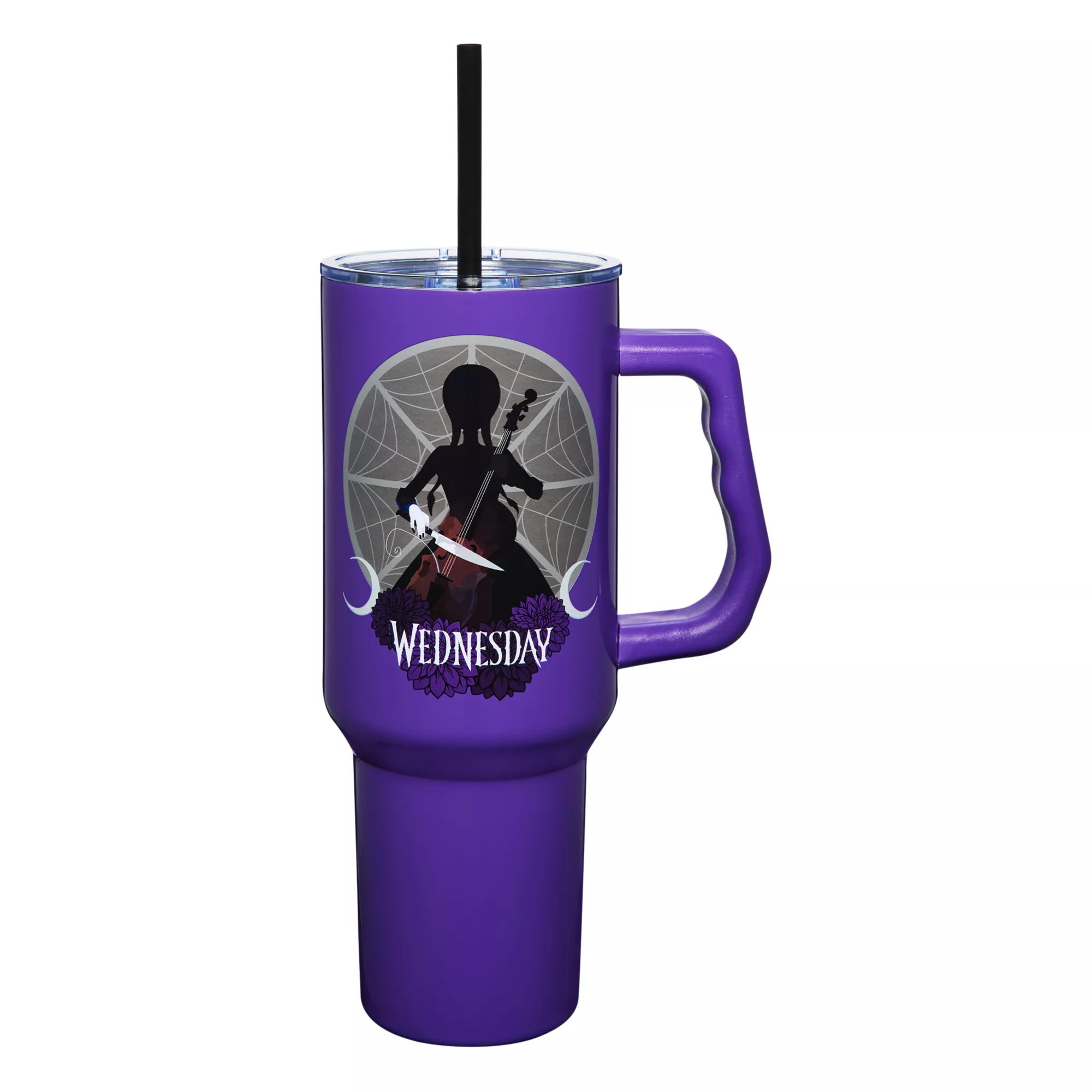 Quench your thirst while showing you're a hardcore fan of Wednesday with this officially licensed travel tumbler with straw. You'll love enjoying your favorite beverage while you watch the next episode of Wednesday with this sweet travel tumbler added to your collection. Take it to school, gym, or work to always stay hydrated!