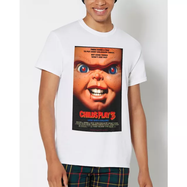 Look who's stalking! He just wants to be your best friend, 'til death! This officially licensed White Child's Play 3 Chucky T Shirt is the perfect addition to any horror fan's closet. Just remember, some things won't stay put...