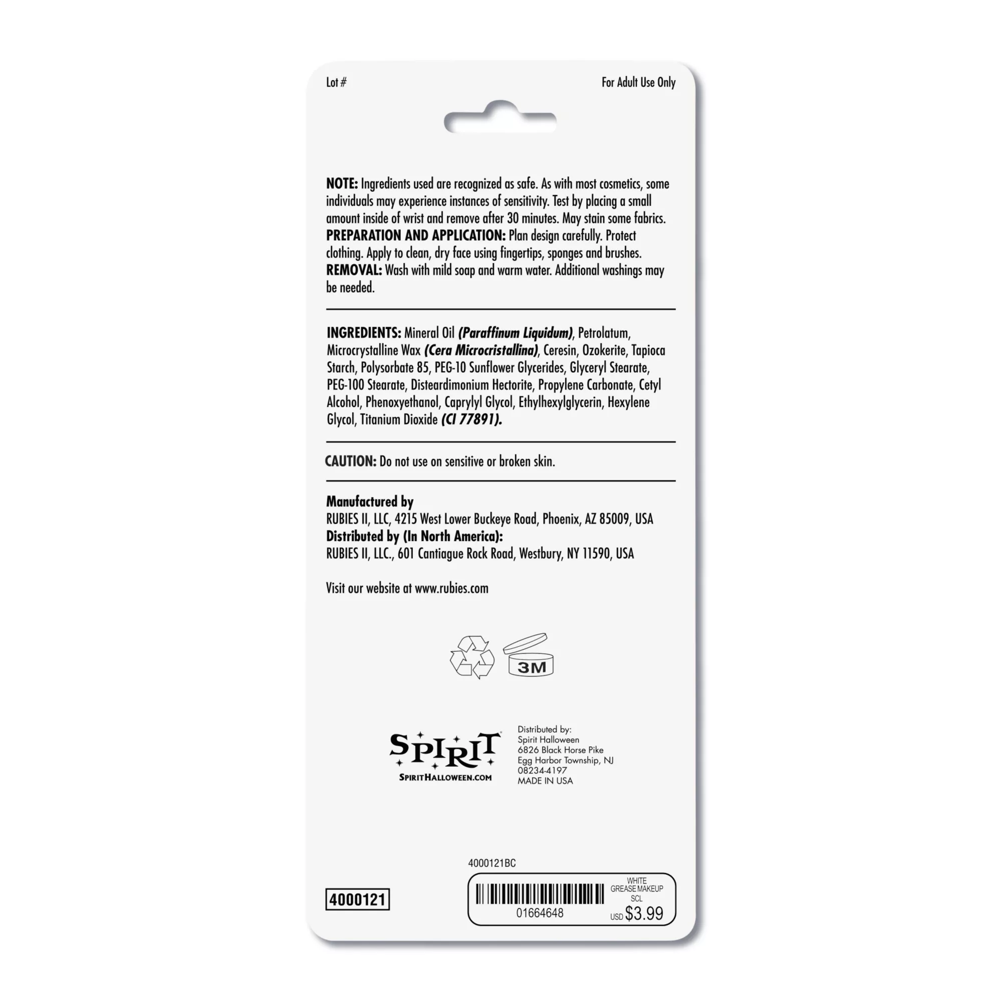 • Ingredients: Polyisobutene, ethyllhexyl palmitate, ozokerite, talc, mineral oil, microcrystalline wax, hydrogenated polyisobutine, caprylic/capric triglyceride tocopheryl acetate, propylparaben, lecithin, polyhdroxystearic acid, isopropyl myristrate, isostearic acid, polyglyceriyl-3 polyricinoleate, titanium dioxide