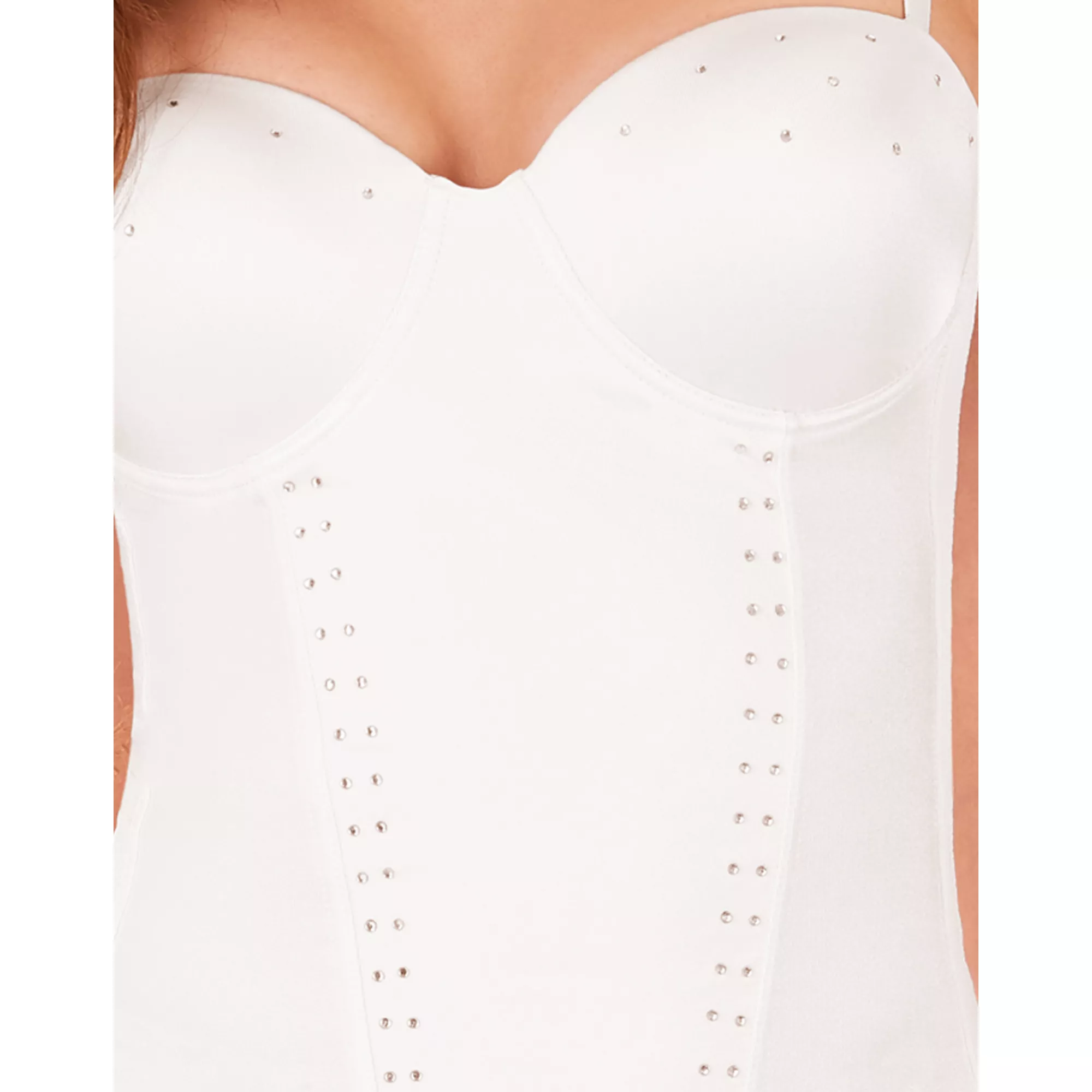 Serve up a dazzling look this Halloween with this white rhinestone corset. This white corset can be the start of any great costume and has embedded rhinestones for that extra dazzling finish. Add some wings (sold separately) to this corset to become an elegant angel, or add an apron (sold separately) to transform into a sexy maid. The options are endless with this corset if you put your mind to it!