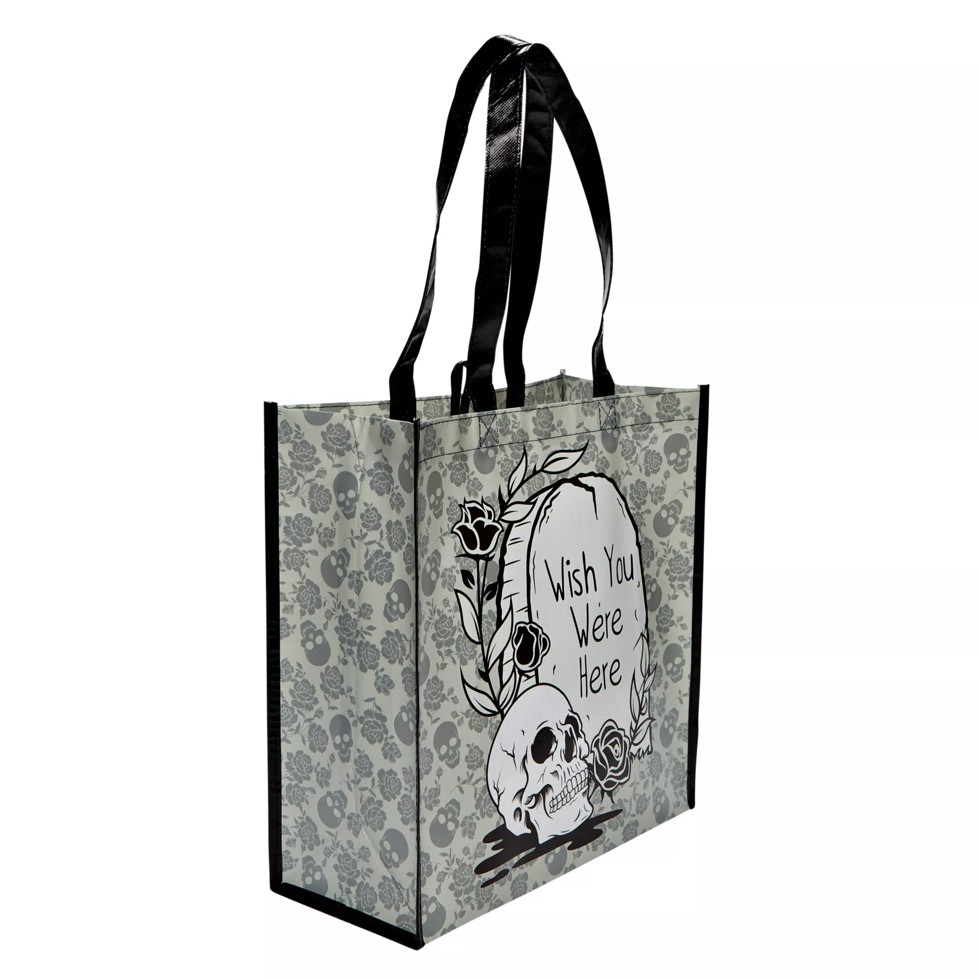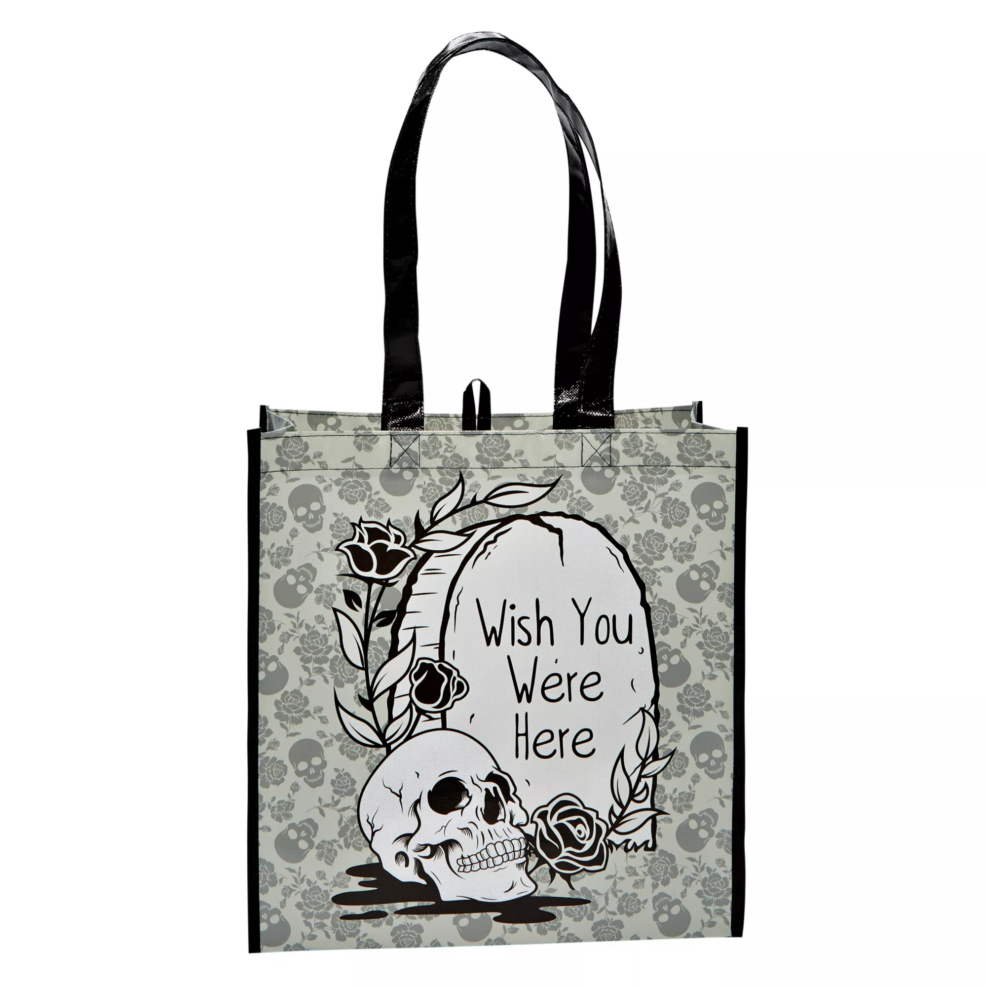 Collect your candy in style this Halloween when you use this stylish skull themed Wish You Were Here Tote Bag. This tote bag features a skull and black roses design on it and is the perfect tote bag to take along trick-or-treating this Halloween.