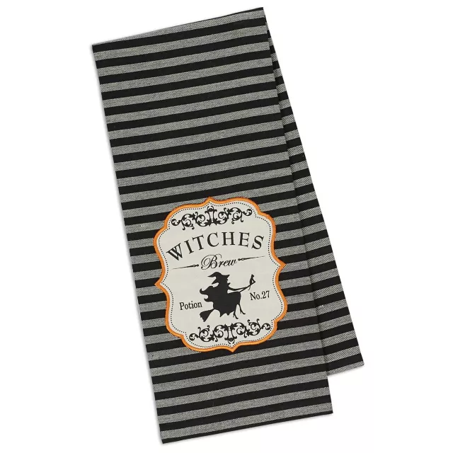 Don't forget your kitchen when decorating your haunted home this Halloween when you can use this Witches Brew Embroidered Dish Towel! Perfect your spooky kitchen with this striped towel featuring a Witches Brew label reading "Potion No.27" outlined in orange stitching.