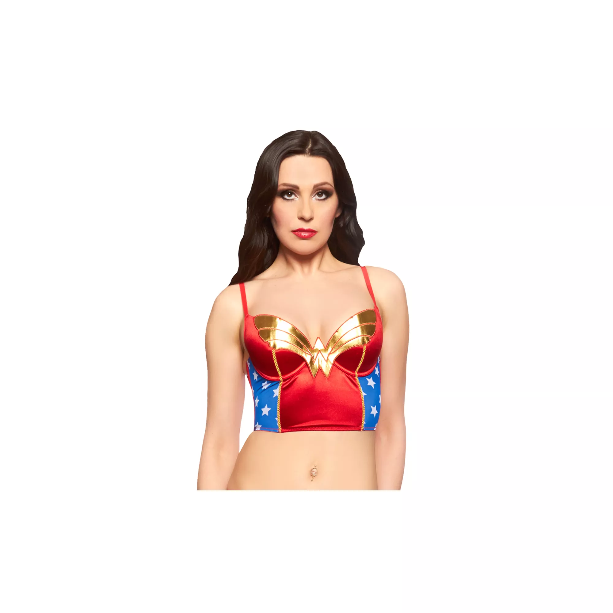 Bring out all the stops in the Officially Licensed Wonder Woman Long Line Bra. Take a twist on the traditional Wonder Woman costume in this red, white and blue long line bra with gold Wonder Woman detail.