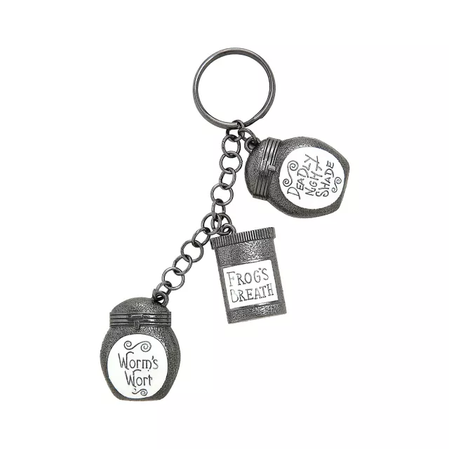 Something foul is brewing! This officially licensed worm's wort soup keychain is sure to delight fans of The Nightmare Before Christmas. Three charms feature the famed concoction's ingredients: worm's wort, frog's breath, and deadly nightshade.