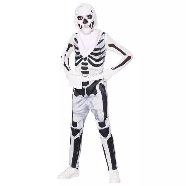 You'll look bad to the bone in this officially licensed Youth Skull Trooper (Inverted) Costume. Featuring the signature white jumpsuit with black bones, a half mask with an attached hood, a belt, a bandana, shin guards, and gloves, you'll have everything you need to bring your favorite Fortnite character to life this Halloween!